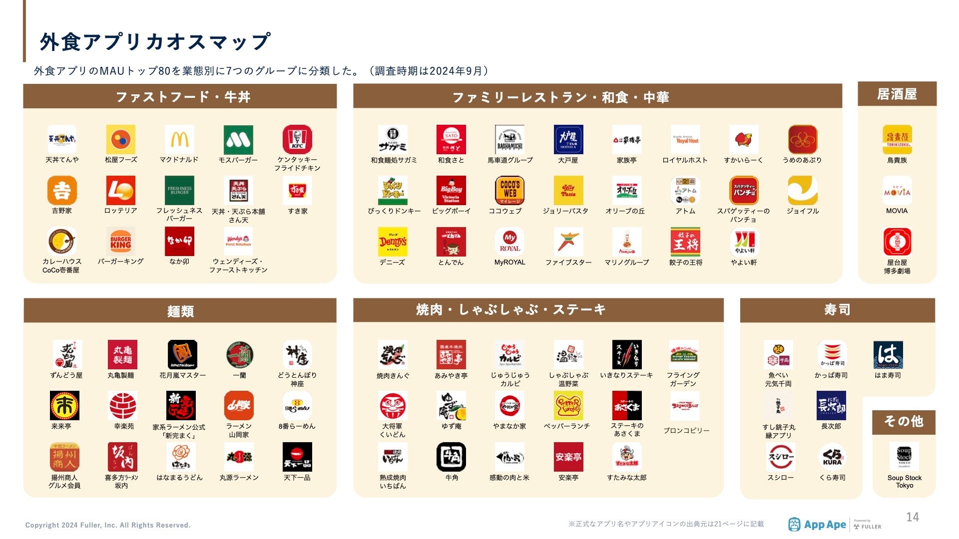 外食アプリのMAUトップ80を業種別に7つのグループに分類しました。