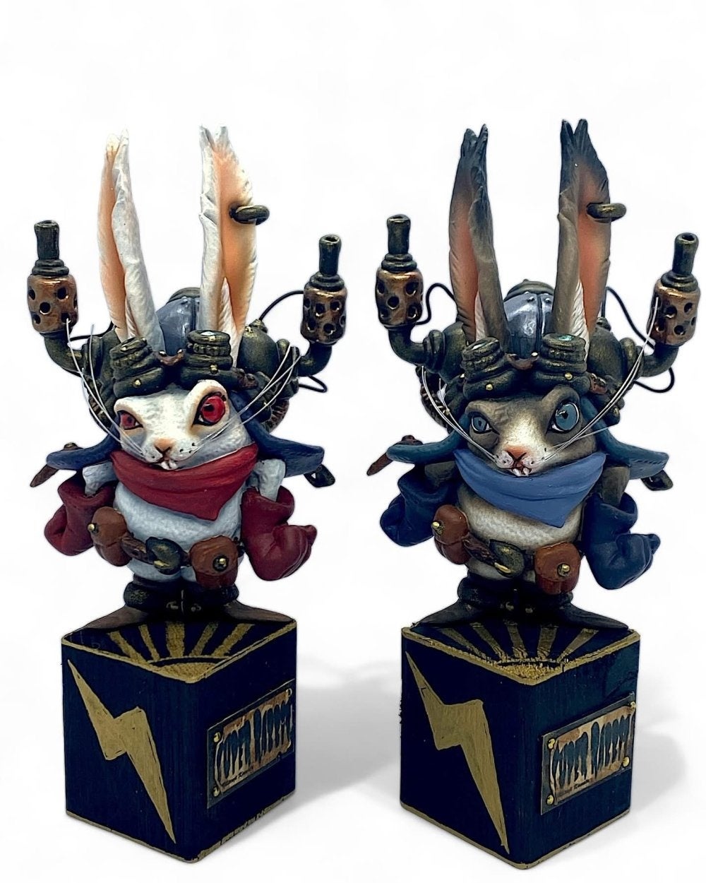 さまざまな生き物たちをデフォルメ擬人化して樹脂粘土で造形し、アクリル絵の具で塗装しています。スチームパンク、中世、海賊など、それぞれにストーリー性を持たせた作品製作をしています。