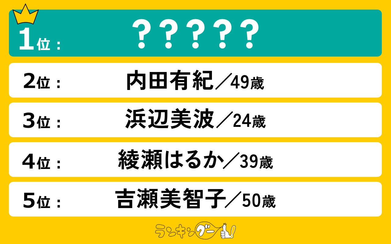 1位は絵画のように凛と美しい、北川景子さんに決定!2位は全く年齢を感じさせない驚異的な美貌をもつ、内田有紀さん。3位は美しく、ピュアな輝きを放つ浜辺美波さん。4位は綾瀬はるかさん。そして、5位は吉瀬美智子さんがランクインしました!