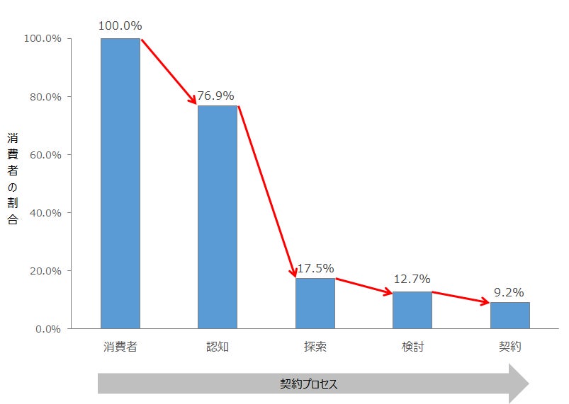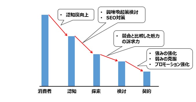 このように、パーチェスファネル分析を行うことにより、どのフェーズで自社の顧客離脱率が高いかを把握することができ、最終的な契約に向けた課題を抽出することができます。さらフェーズごとに顧客が脱落した理由を把握することで、自社が次に取るべきアクションにつなげることも可能となります。
