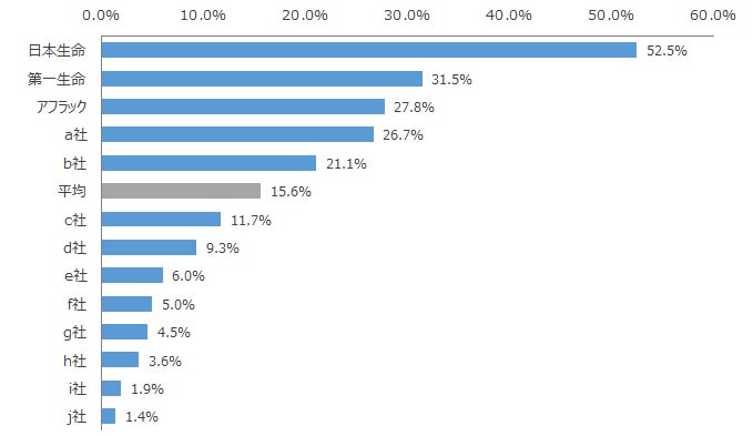 また、5番目までに思い出した純粋想起率の平均は15.6%となりました。トップは日本生命(52.5%)、次いで第一生命(31.5%)、アフラック(27.8%)が続きました。