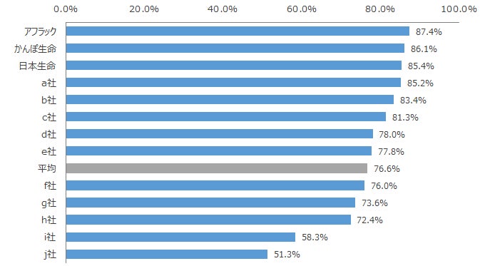 対象13社の生命保険会社を列挙した上で、知っている生命保険会社(助成想起)を調査したところ、助成想起率の平均は76.6%となりました。トップはアフラック(87.4%)、次いでかんぽ生命(86.1%)、日本生命(85.4%)が続きました。