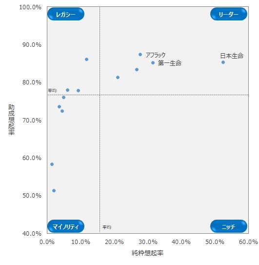 純粋想起率と助成想起率をもとに、各企業をポジショニングしたところ、助成想起も純粋想起も高い「リーダー」に位置するのは日本生命をはじめとする5社となりました。また助成想起は高いものの純粋想起は低い「レガシー」に位置するのは3社、純粋想起も助成想起も低い「マイノリティ」に位置するのは5社となりました。