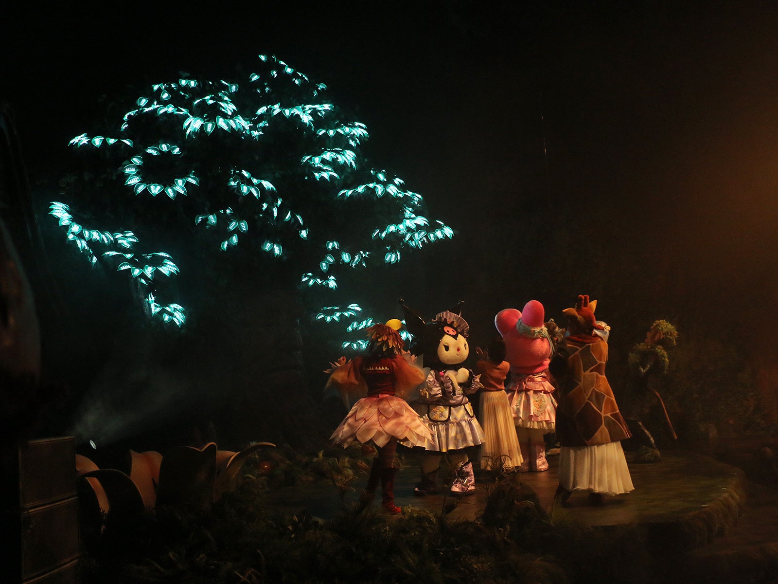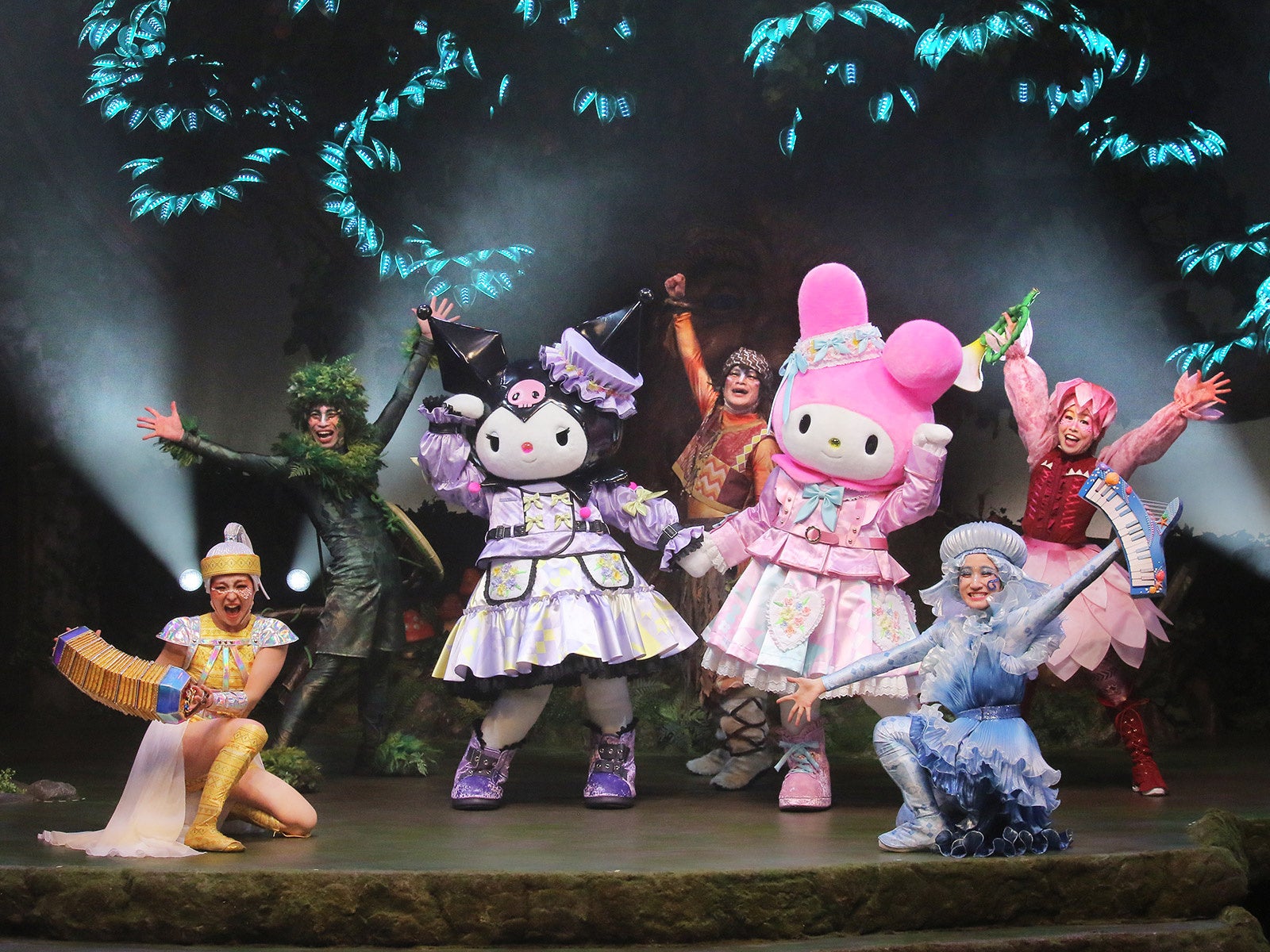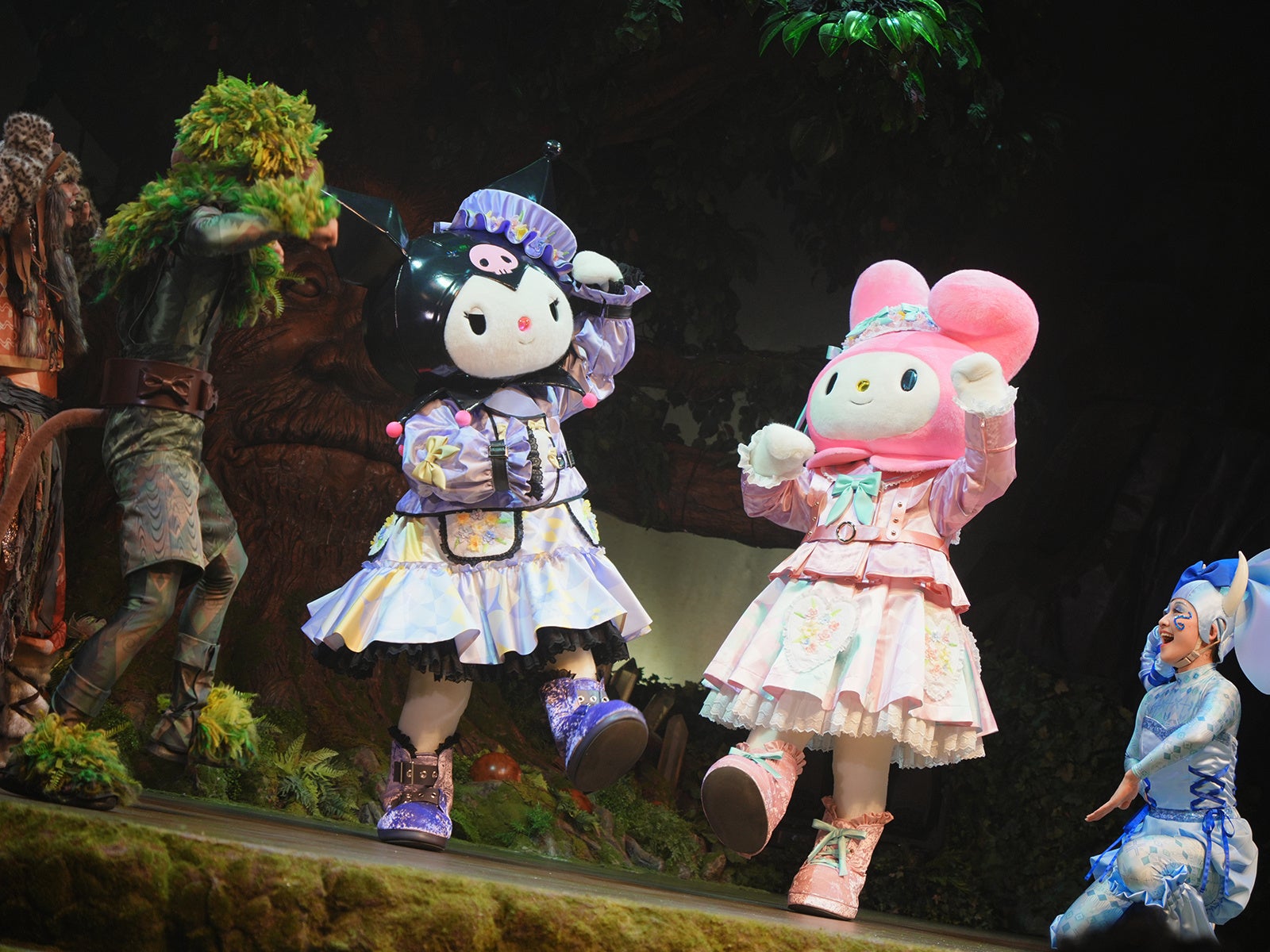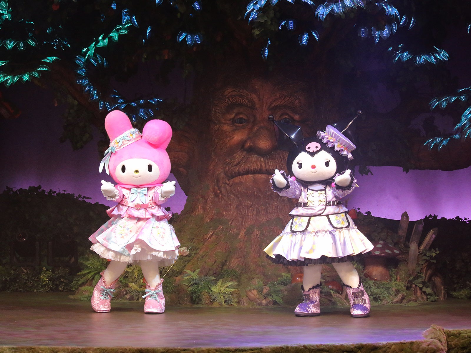 妖精の森にいろいろな世界の妖精たちが集まる特別な日。マイメロディとクロミも招待されパーティが始まります。大地の妖精の演奏にあわせ、光・花・水・木の妖精たちが続々と登場する華やかなオープニングでショーがスタートしました。