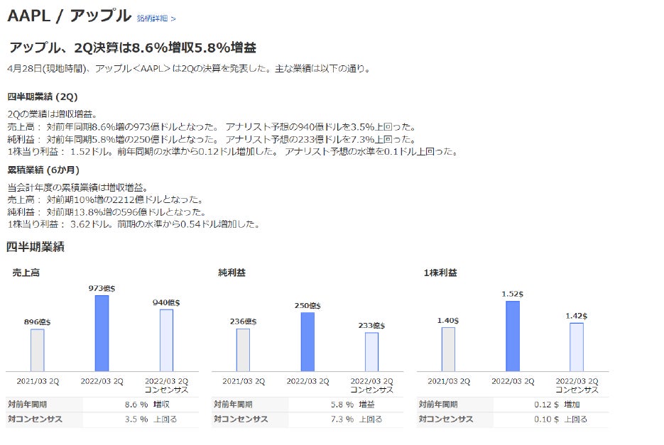 楽天証券株式会社(本社:東京都港区、代表取締役社長:楠 雄治、以下「楽天証券」)は、2022年6月26日(日)より、米国株式の投資情報を拡充し、「米国株決算速報」の提供を開始することをお知らせします。