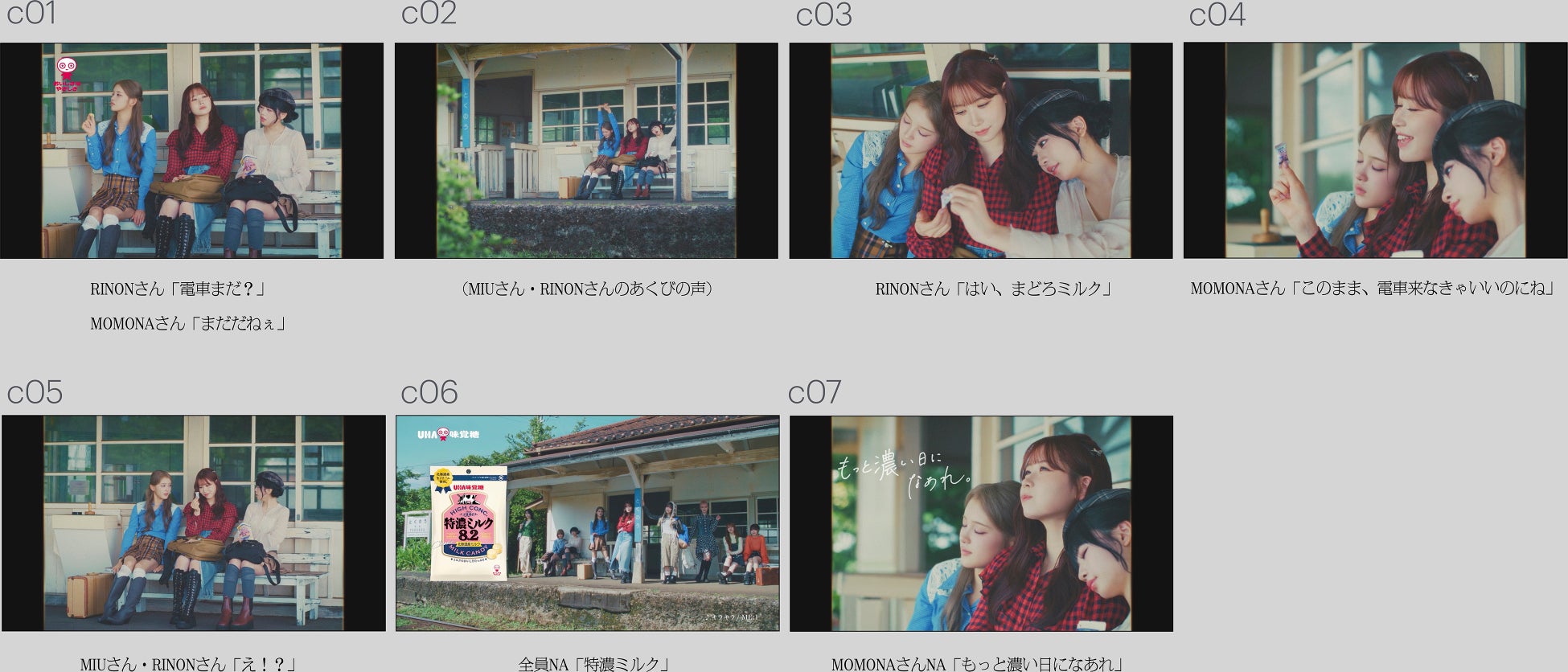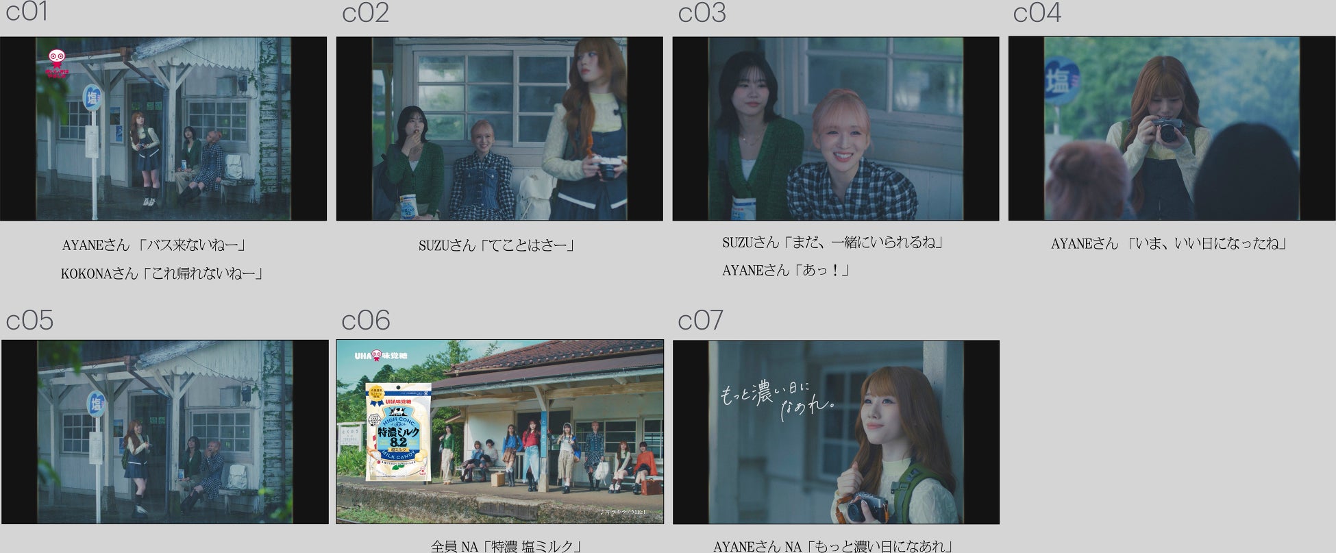 駅のホームやバス停を舞台に、待ち時間を過ごすME:Iのメンバーたちの様子を切り取る新CM。天気やシチュエーション、メンバーのキャラクターや組み合わせによって変わる仲間との過ごし方を3篇のショートストーリーとして描きました。退屈な待ち時間や雨宿りの瞬間も、そこに大切な仲間の存在と「特濃ミルク」があるだけで、顔がほころぶ。やさしい気持ちになれる。いい日になる予感がする・・・。そしてその心地の良い余韻は、周囲の雰囲気にも溶けていきます。ラストカットでは、まるで何気ない待ち時間が永遠につづいてほしいかのように、「もっと濃い日になあれ。」と心の声で願掛けをします。