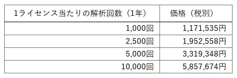 1ライセンス当たりの1年の解析回数上限と価格は次のとおりです。