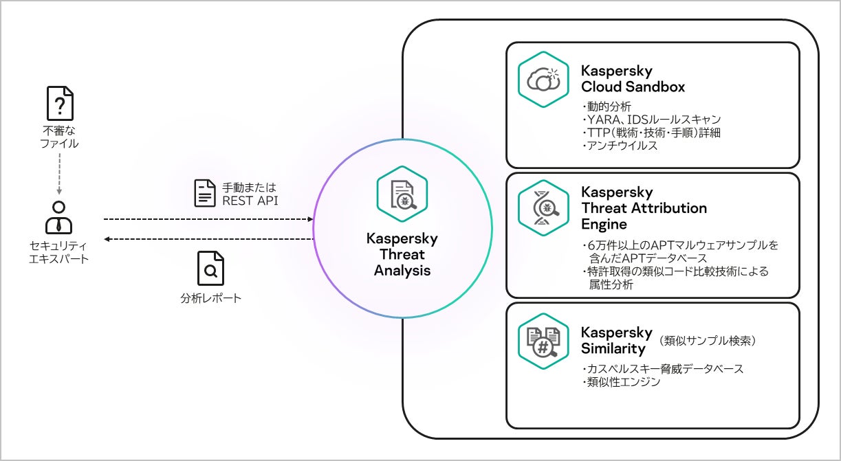 図1:「Kaspersky Threat Analysis」に含まれる「Cloud Sandbox」「Kaspersky Threat Attribution Engine」「類似サンプル検索」の全体像