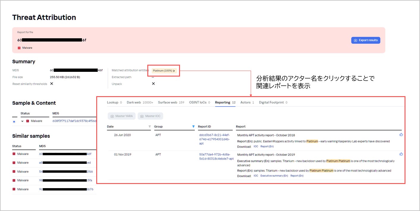 図3:「Kaspersky Threat Attribution Engine」により、不審なファイルは脅威アクター「Platinum」に関連することが判明した例。アクター名をクリックすることで、「APT Intelligence Report」で提供する関連レポートの閲覧が可能(同サービスを契約している場合)