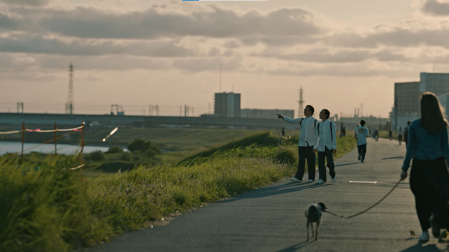 また、子役の男の子が登場するシーンでは、男の子に「あ、どうぞどうぞ・・・」と言いながら場所を譲ろうとするアドリブを入れるなど、お二人の人柄に癒され、笑顔あふれる現場となりました。最後の河川敷のシーンは夕日を見ながら兄弟が仲良く歩く姿が印象的です。しかし、マイクが入っていなかったのでお話しの内容は二人だけの秘密となりました。和やかな雰囲気のお二人は一体何をお話しされているのだろう?と、スタッフ一同、丸一日かかった撮影を温かい気持ちで終えることができました。