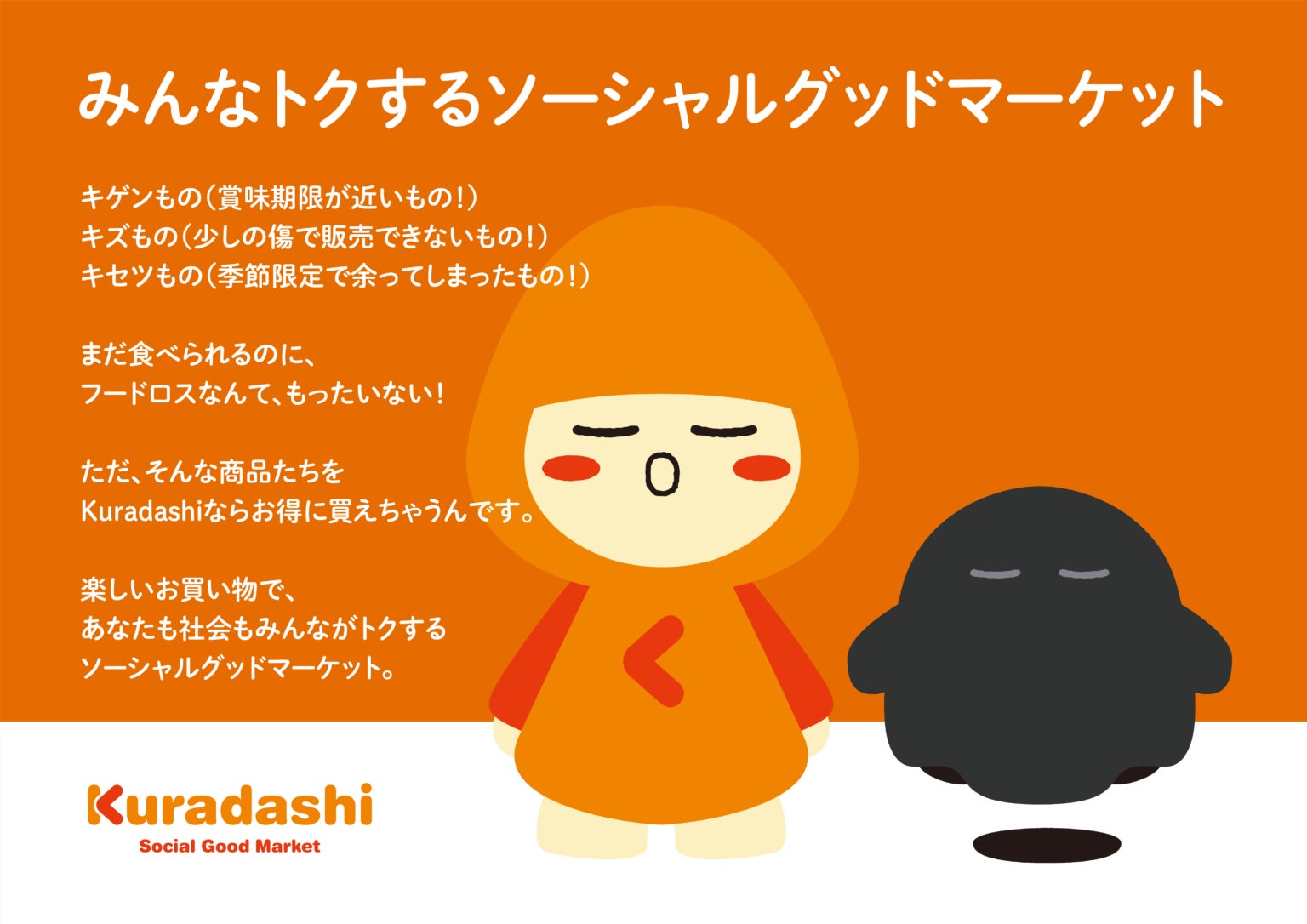「Kuradashi」、「1.5次流通」、「もったいないを価値へ」は株式会社クラダシの登録商標です。「Kuradashi」ロゴ、「ソーシャルグッドマーケット」は商標登録出願中です。