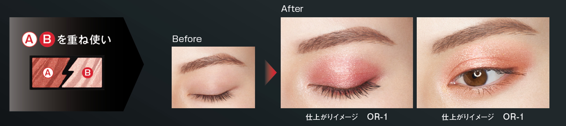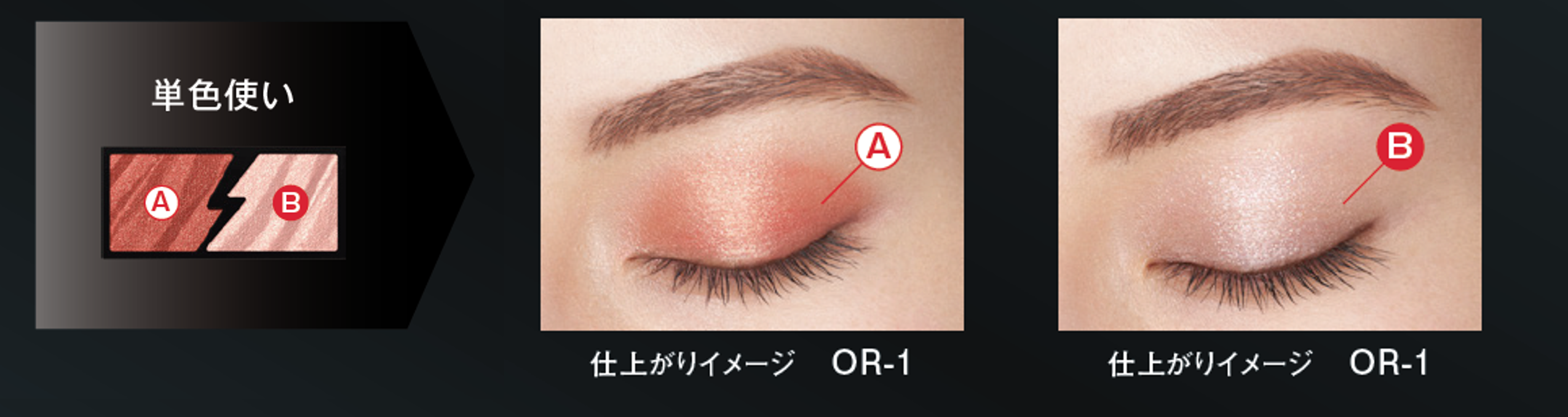 ①重ね使い:贅沢な輝きのⒷを重ねるほどに、色と光が重なり合い鋭い輝きを放つ、発光感のある仕上がりに。