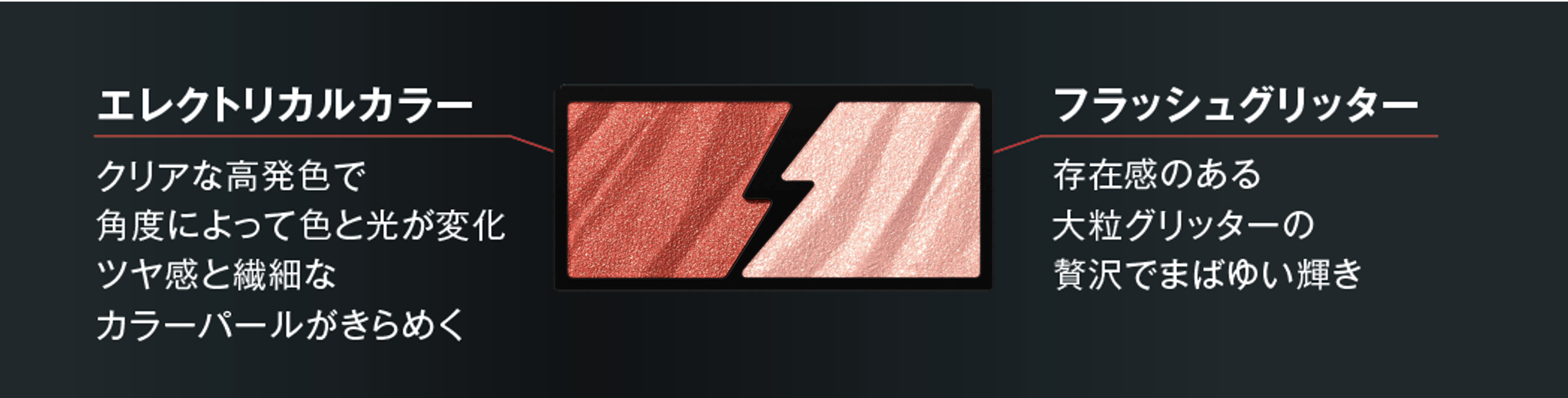 KATEの新アイシャドウパレット「ケイト エレクトリックショックアイズ」は、クリアな高発色で、ツヤ感と繊細なカラーパールがきらめく「エレクトリカルカラー」と、贅沢でまばゆい輝きを放つ大粒グリッター「フラッシュグリッター」の質感の異なるふたつの輝きが、火花のようにクラッシュした発光感をもたらします。まぶたにピタッと密着する「オイルリッチ処方」で大粒のグリッターも落ちにくく、また、重ね使い・単色使い・頬やデコルテなど様々な使用方法で自由自在に自分だけの輝きを演出することができます。どんな時でも、自分らしく、自由なメイクアップを楽しんでいただきたいという想いで開発いたしました。