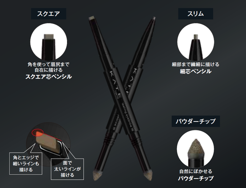 角を使って眉尻まで自在に描けるスクエア芯【スクエア】と細部まで繊細に描ける細芯【スリム】の2類のペンシルから選べます。