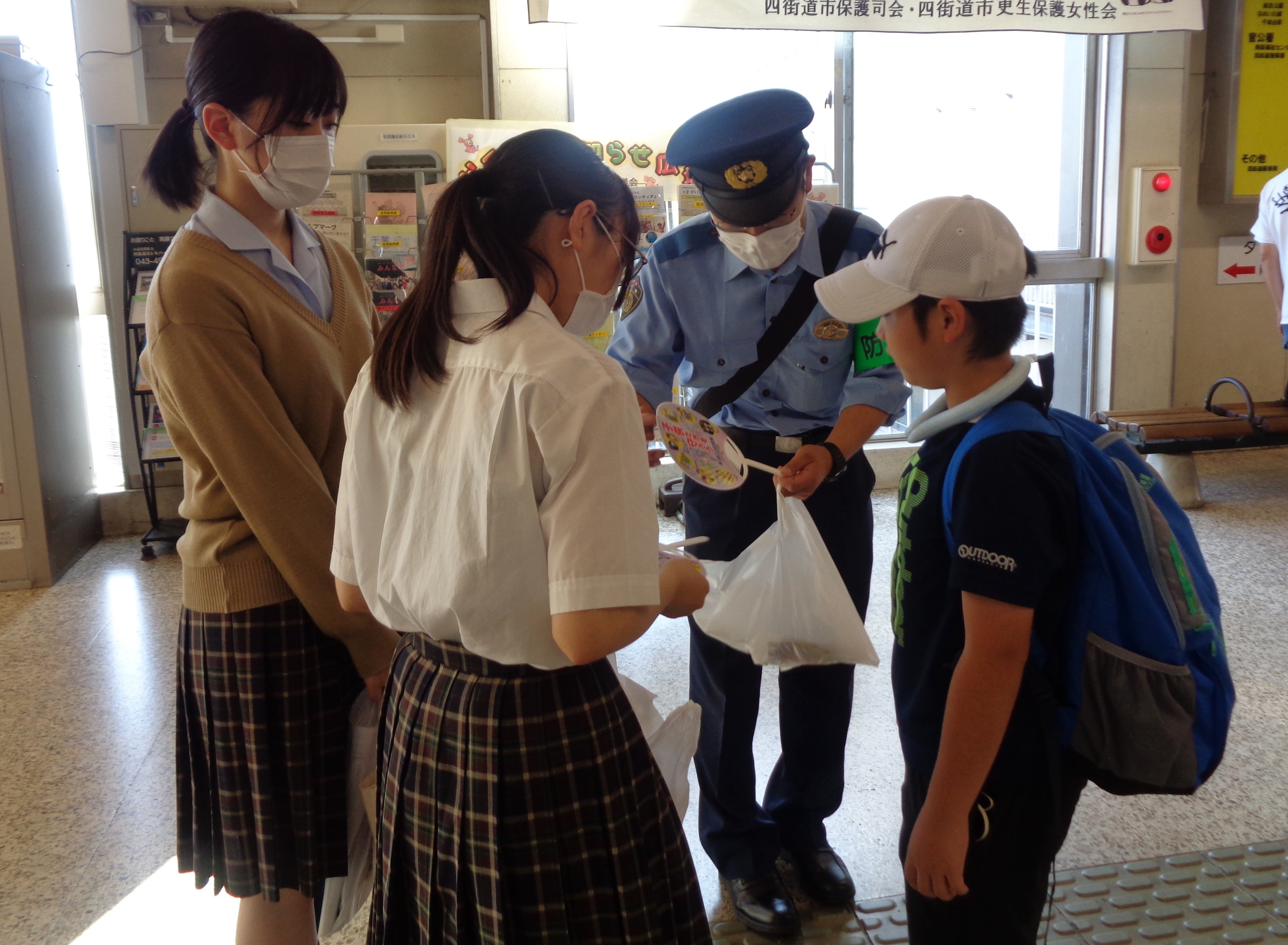 最初は緊張気味だった高校生たちも、次第に積極的に通行者に声をかけるようになり、小中学生や高校生にうちわ等の青少年健全育成啓発物資を配付しながら、笑顔で交流していました。