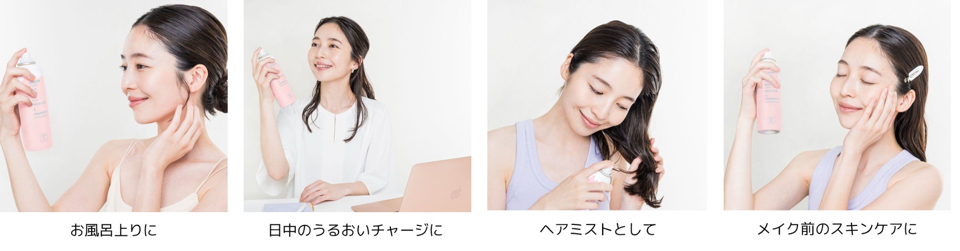 SHEE BY LITS「炭酸※1ミルクミスト」は、炭酸※1とミルク※3を配合したミスト化粧水。シューっと一吹きで、しっとりしたうるおいが続きます。お風呂あがりにも、日中にメイクの上からでも、いつでもどこでも使用可能。