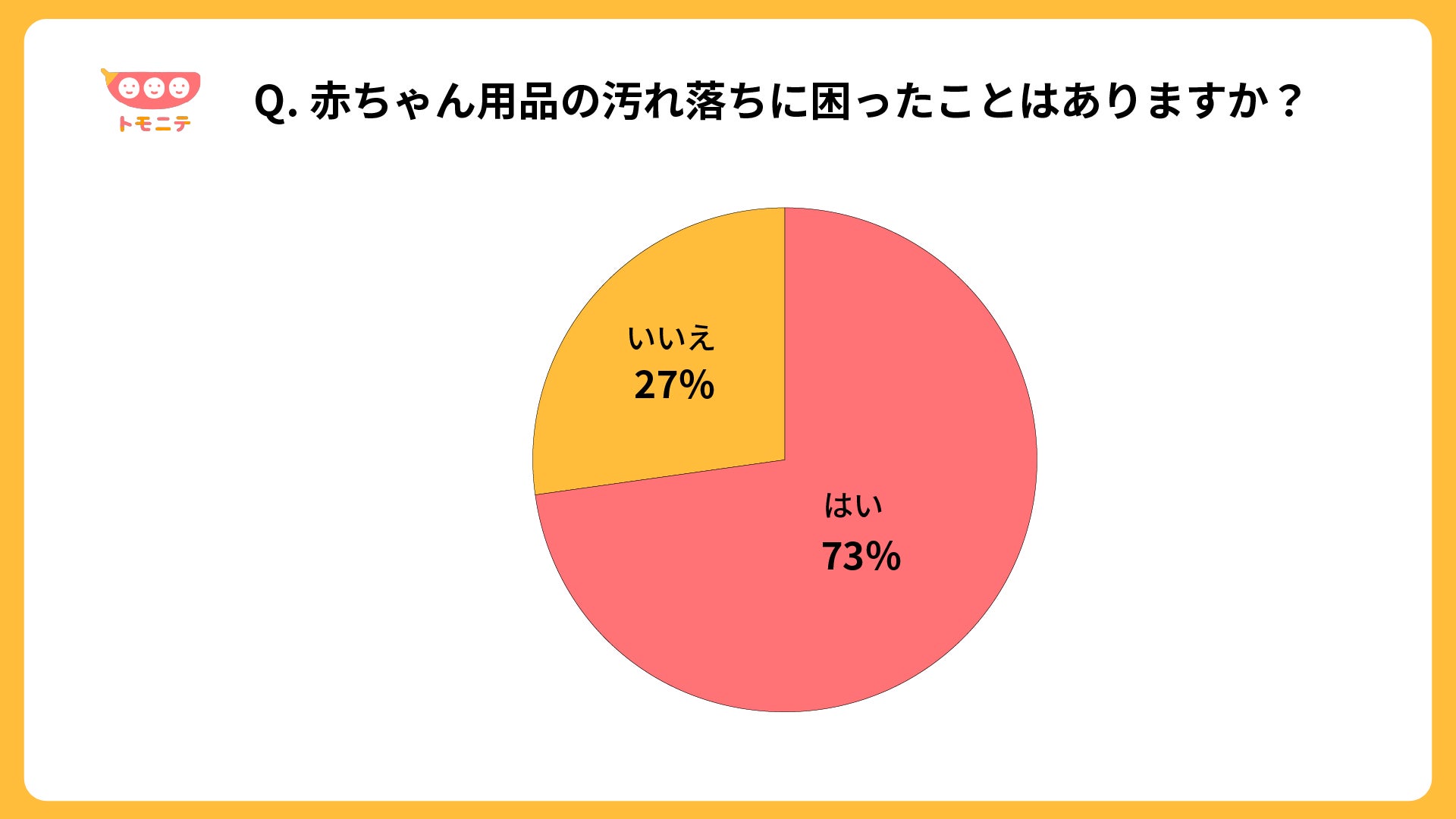 また、赤ちゃん用品の汚れ落ちについて困ったことがあるかを伺うと、73%が「はい」と回答しました。成分が強力なイメージを持つ方も多いオキシクリーンですが、実は粉末タイプは、香料・界面活性剤不使用のため乳幼児のアイテムに使うのもオススメ。気を使いがちな赤ちゃんの洗濯にも使いやすい上、大人用の洗濯と使い分ける必要もなく、乾きにくい梅雨時期でも洗濯回数を減らすことができます。詳細は、特集連載2週目の投稿で解説予定です。