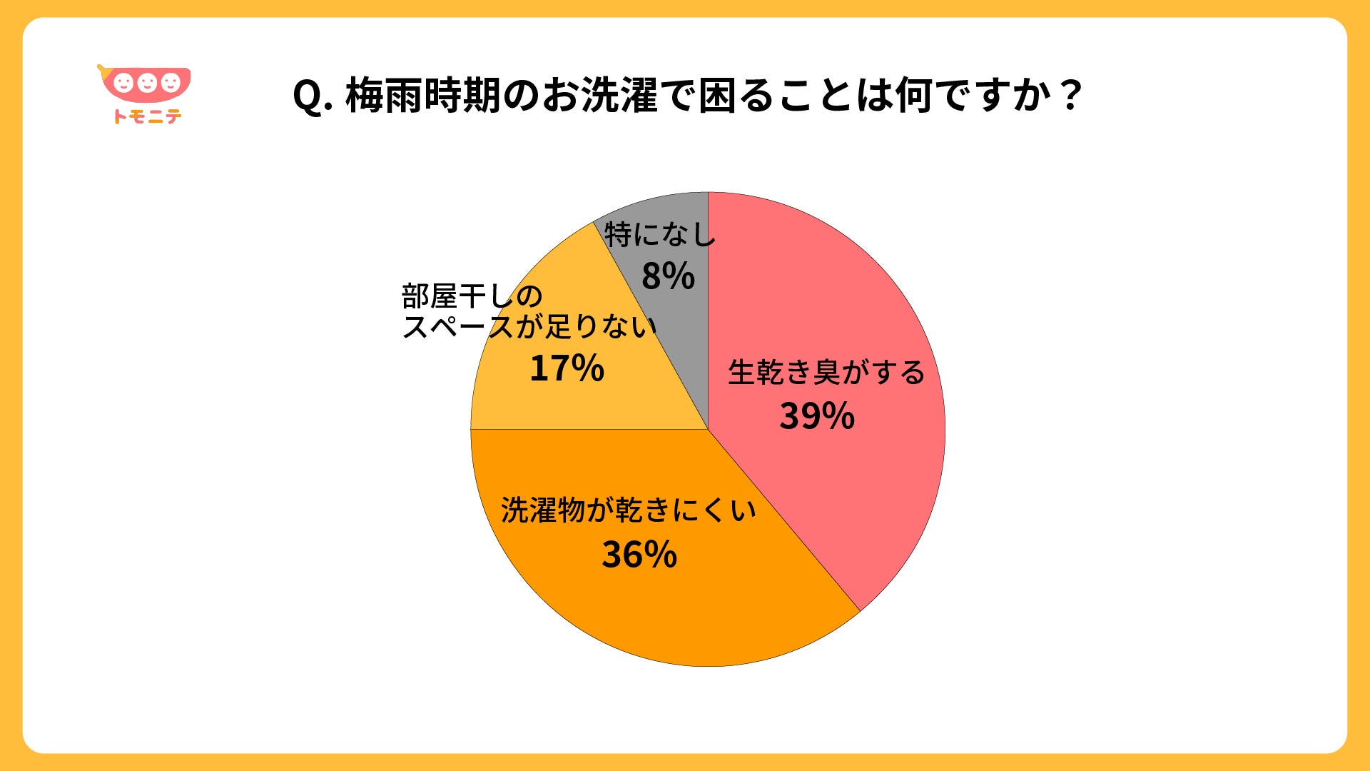 トモニテでは今回の特集に合わせ、ユーザーを対象に「梅雨時期のお洗濯」についてアンケートを実施。「梅雨時期のお洗濯で困ること」について伺うと、「生乾き臭」が39%で最多でした。汚れ落としとしてのイメージを持つ方がオキシクリーンですが、実は生乾き臭対策にも有効です。連載初回の投稿では、生乾き臭対策に効く「オキシ足し」について解説します。