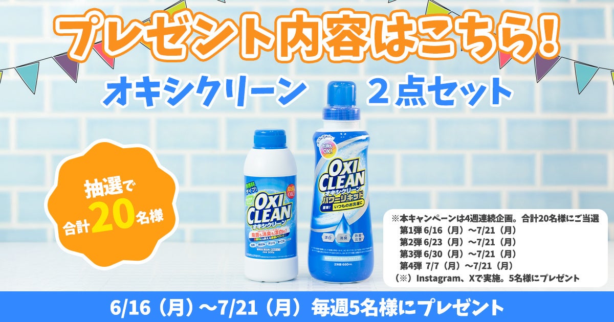 毎週5名様に「オキシクリーン&オキシクリーン パワーリキッドの2点セット」が当たるプレゼントキャンペーンも実施します。