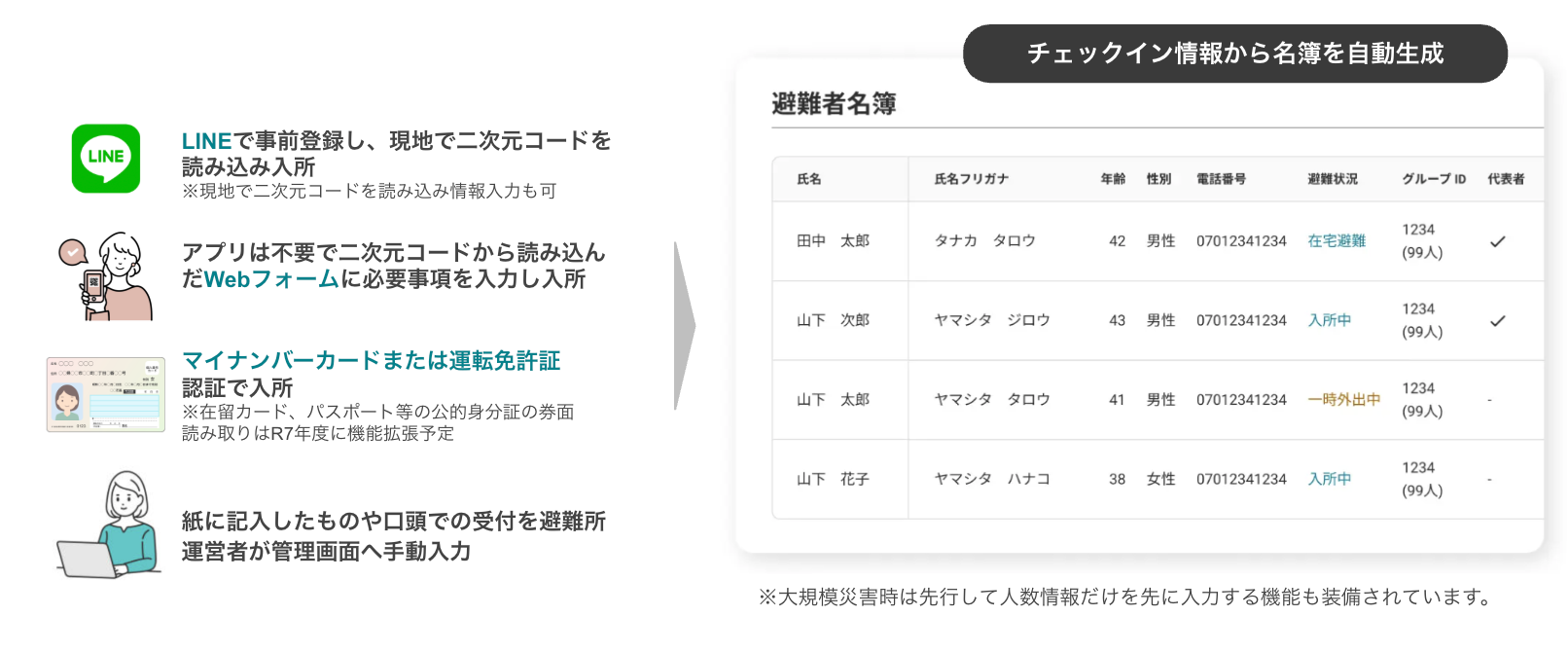 本実証では、令和7年度北海道防災総合訓練(第2回)において、住民に避難所のデジタル受付の流れを実際に体験いただき、避難所運営者の運営稼働削減効果(受付時間の計測)や、入所情報の集計・報告のデモを含め、災害時のスムーズで安全な避難と、職員の業務負荷軽減の両立可能性を検証することを目的として実施します。