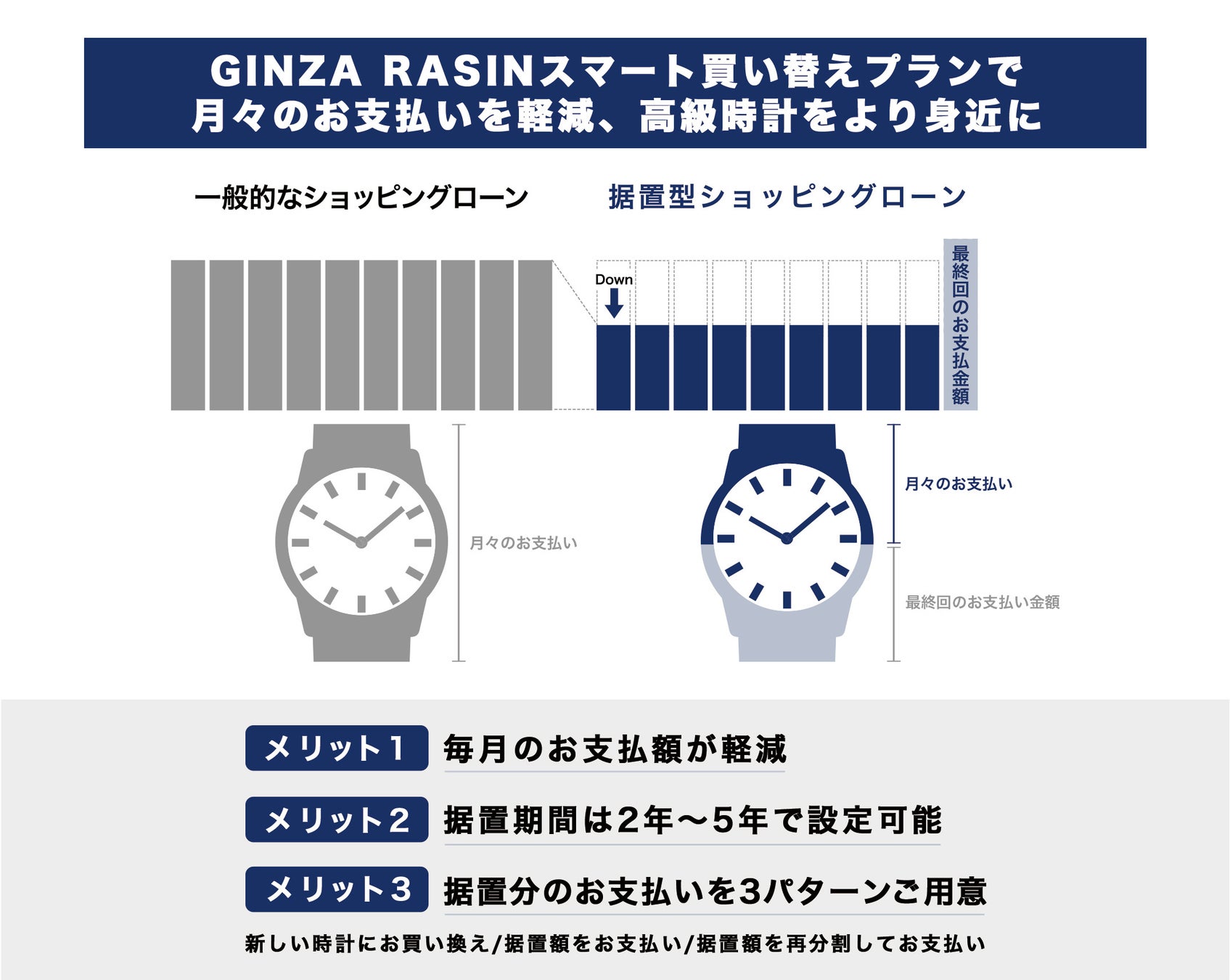 高級時計の購入や買い替えの際、GINZA RASIN 据置型ショッピングローン スマート買い替えプランでお客様ひとりひとりの資金計画やライフプランに合わせてご利用いただくことができます。当社は多くのお客様に最も素敵な時計を選んでいただけるよう、今後も新たなサービスを提供いたします。