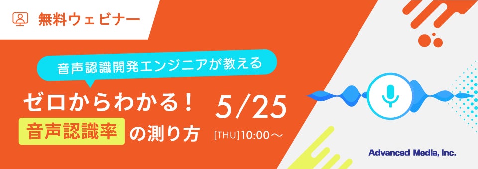 2023年5月25日(木)、株式会社アドバンスト・メディア(本社:東京都豊島区、代表取締役会長兼社長:鈴木清幸 以下、アドバンスト・メディア)は、4月に開催し200名以上にご参加いただいたオンラインセミナー「音声認識開発エンジニアが教える~ゼロからわかる!音声認識率の測り方~」をご好評につき再開催いたします。