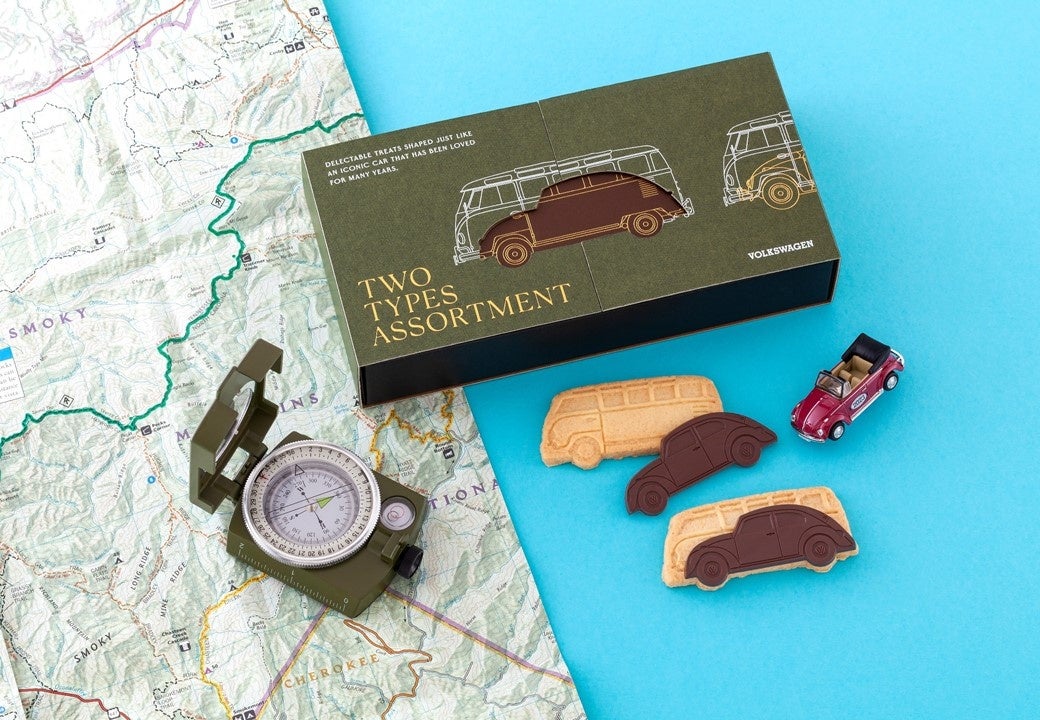 フォルクスワーゲンType2(バス)型の、3種の異なる味わいのチョコレートを、ビートル型チョコレートや、バスのプレートチョコレートとアソート。
