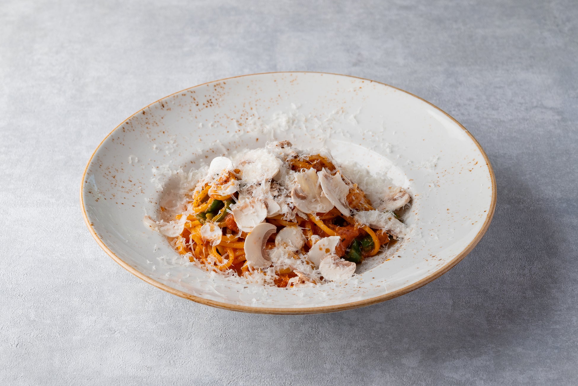 肉厚ピーマンや島根ポークのベーコンを使い、自家製トマトソースで上品な仕上がりに。甘さ、酸味、コクのバランスの良い、大人のナポリタン。
