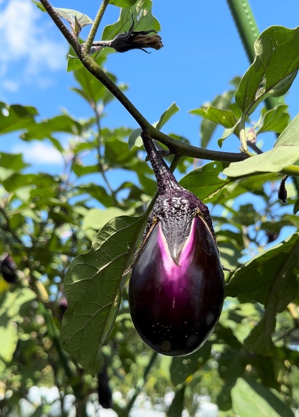 みずみずしい堺産のごちそうなすを手で割き、薄切り生ハム、グラナパダーノ、隠し味の金山寺味噌で仕上げた夏の前菜。