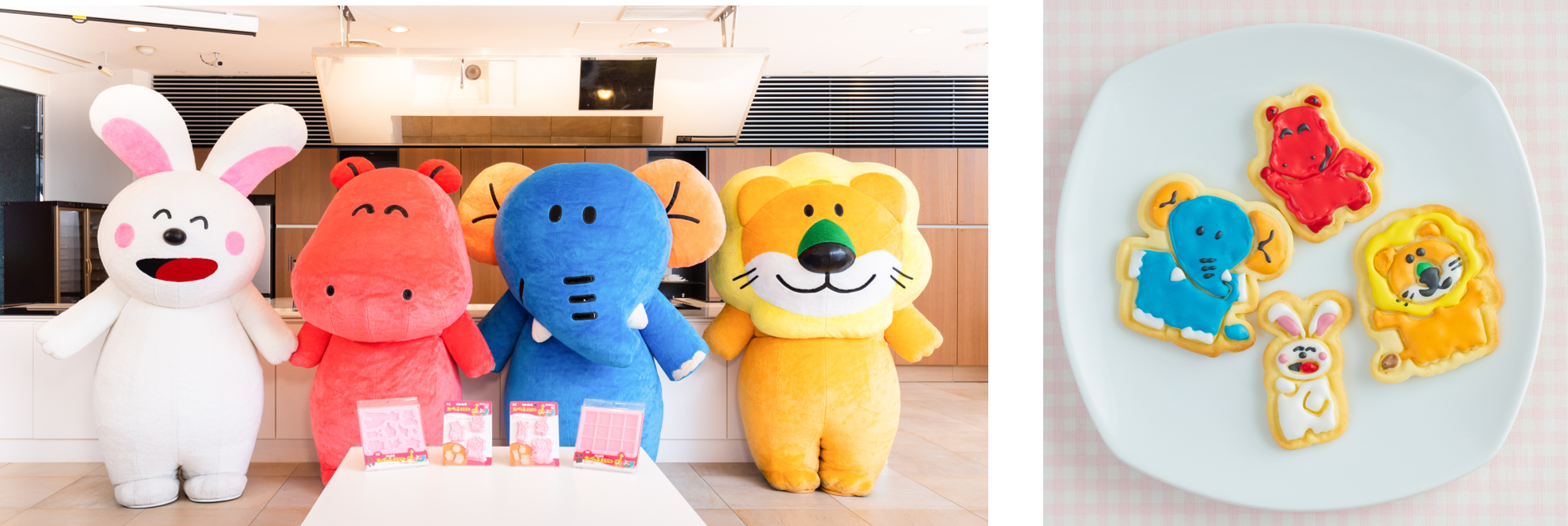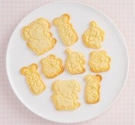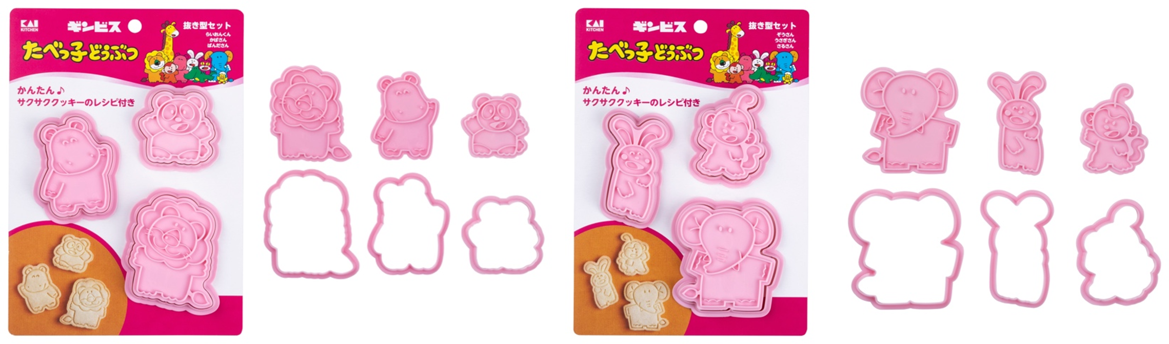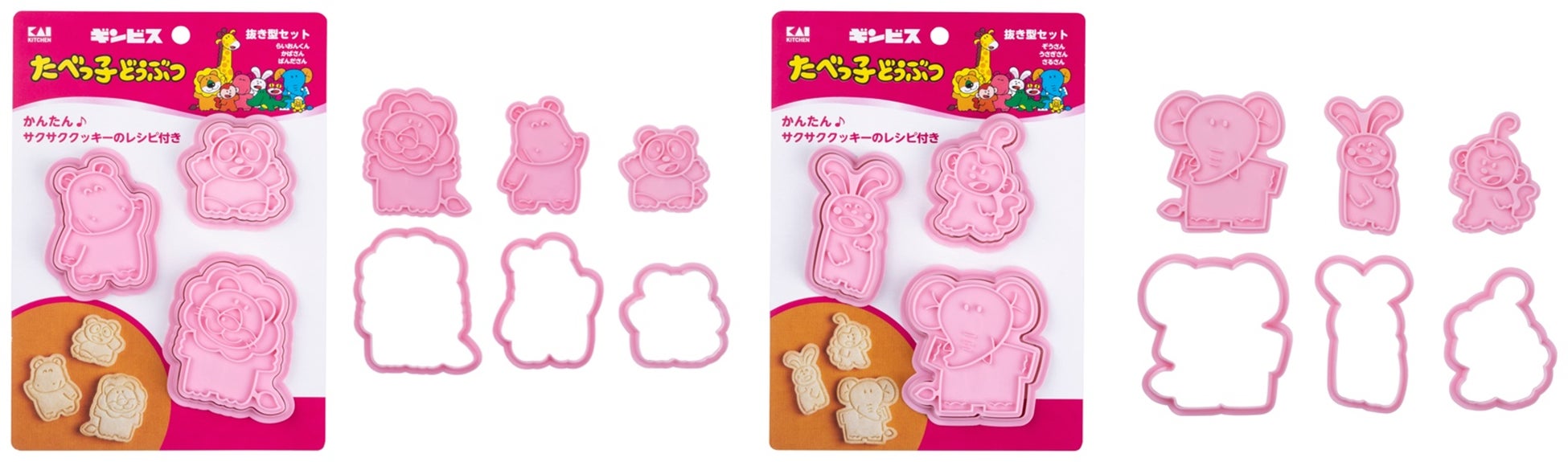 たべっ子どうぶつのキャラクターのクッキーを作れる、抜き型とスタンプ型のセットです。細かい表情をスタンプで簡単に表現することができます。らいおんくん・かばさん・ぱんださん、ぞうさん・うさぎさん・さるさんの2つの組み合わせで展開。