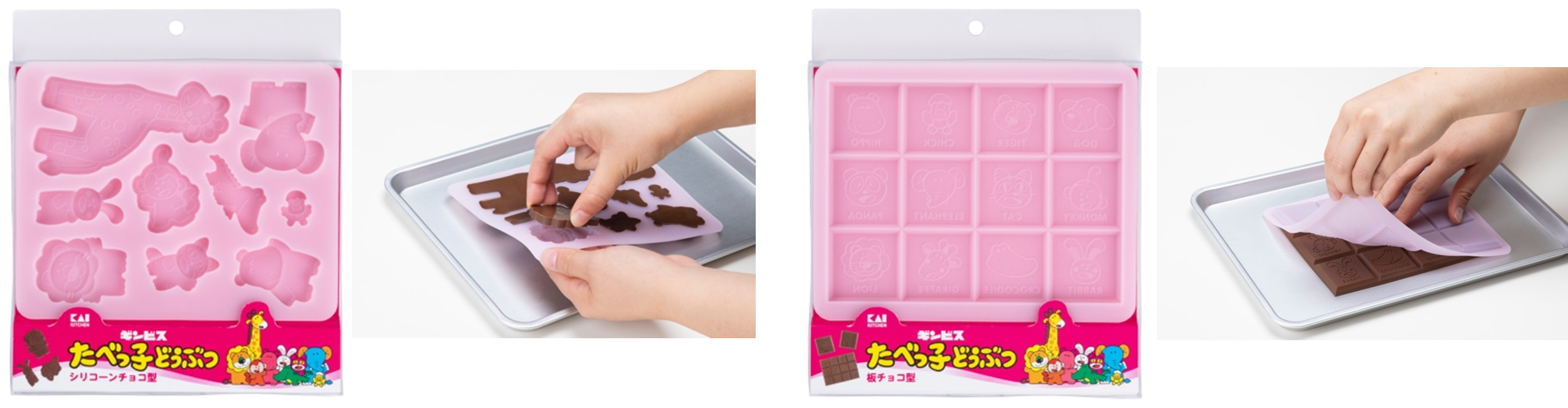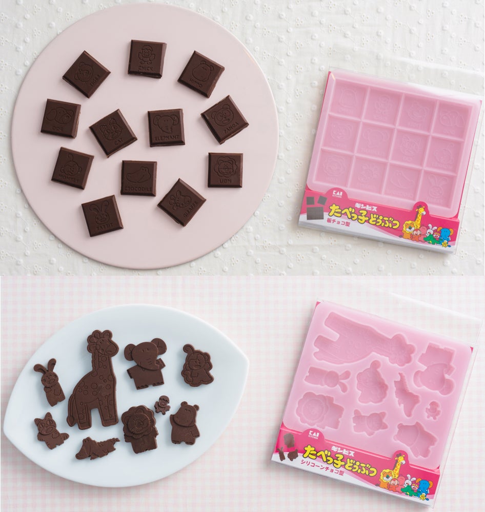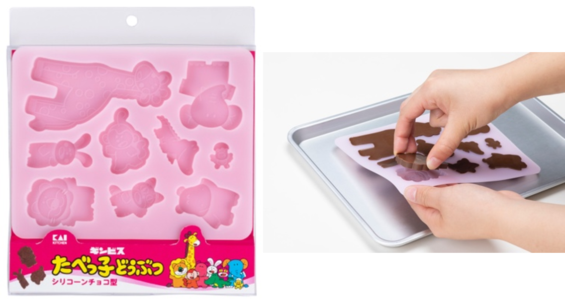 たべっ子どうぶつの9種類のキャラクターのチョコレートを一度に作れるシリコーン型です。チョコレート以外にも、グミや氷作りにも使えます。