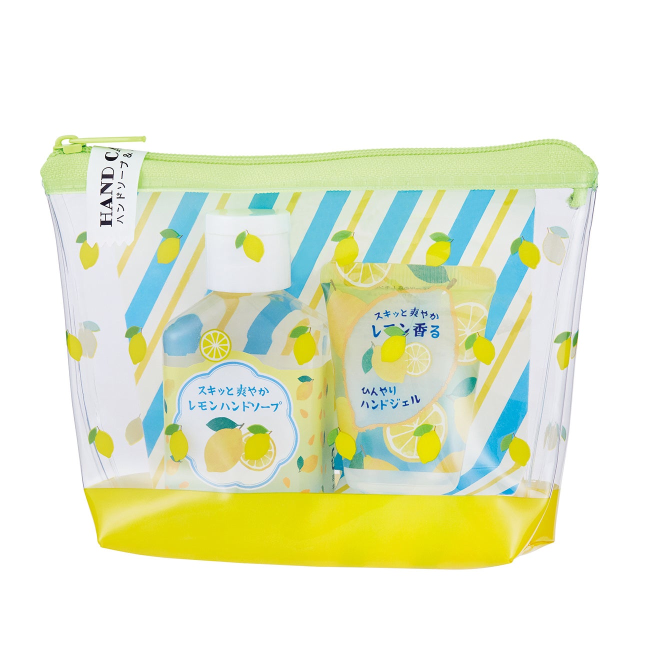 どこか懐かしいレモン柄のビニールポーチに、お出かけ先で使いやすいミニサイズのハンドソープと涼しくうるおすひんやりハンドジェルがセットになりました。