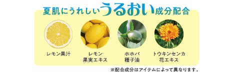 あまずっぱいレモンがスキッと爽やかに香る「レモン」シリーズは、夏の肌にうれしいうるおい成分配合で、紫外線や冷房で乾燥しがちな肌をうるおしながら整えるアイテムが揃います。