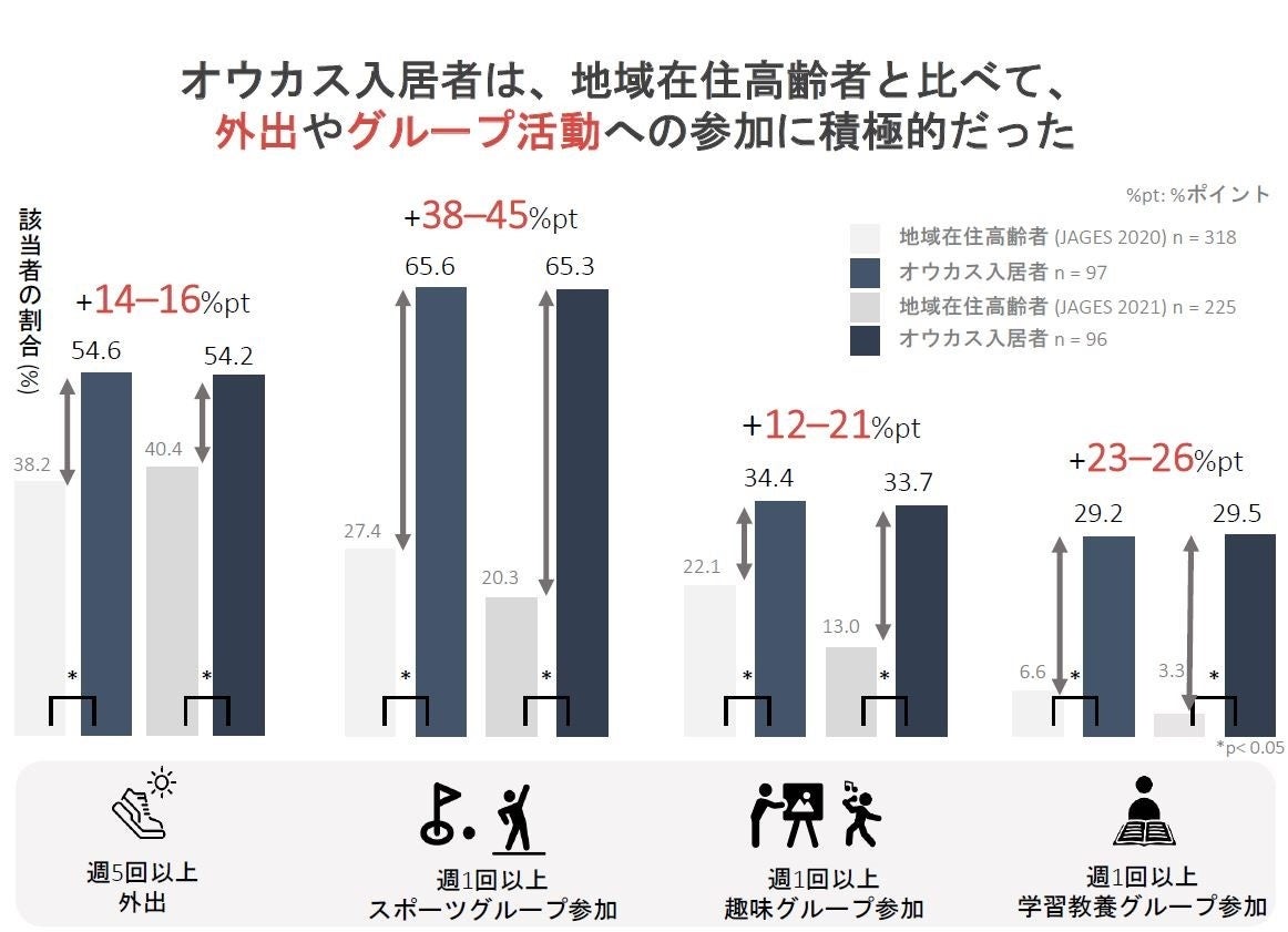 オウカス入居者は地域在住高齢者と比べて、週5回以上外出する人の割合が14–16%ポイント多く、また週1回以上のグループ活動に参加する人のうち、スポーツ、趣味、学習教養に参加する人の割合が、それぞれ38–45、12–21、23–26%ポイント高いことが明らかになりました。今回の結果から、オウカス入居者は地域在住高齢者に比べて、身体活動や社会活動に積極的に取り組んでいることが分かりました。