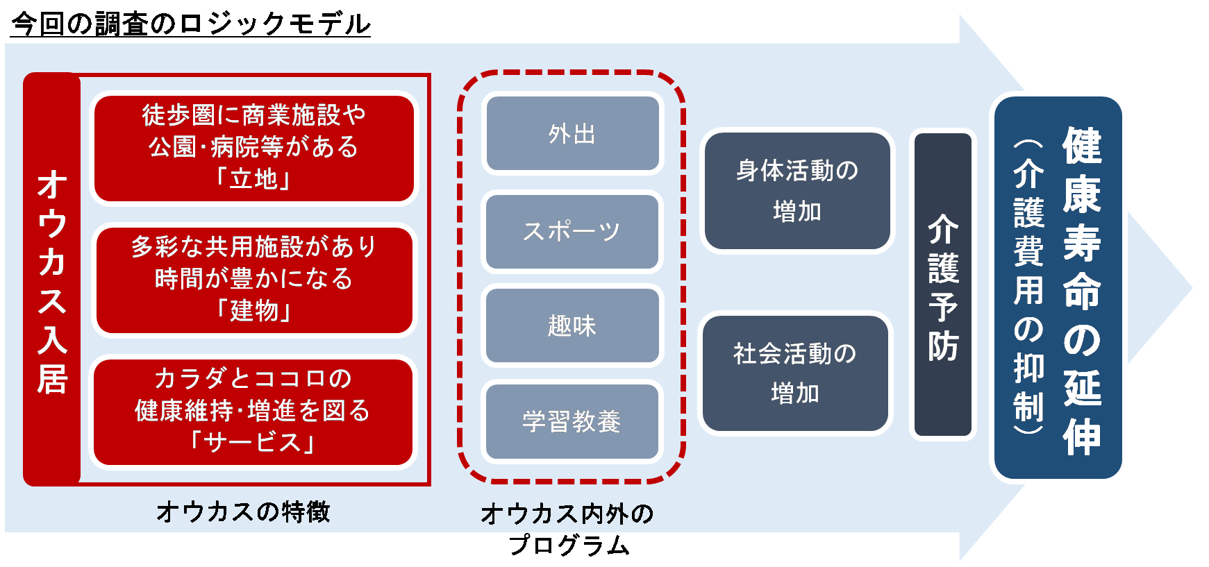 高齢者の身体活動や社会活動は介護予防に効果的であることが知られています。今回の調査は、オウカスに暮らすことで、身体活動や社会活動がどれくらい増え、また健康維持・増進に寄与しているかを検証するため、下記のようなロジックモデルに基づいて調査を実施しました。