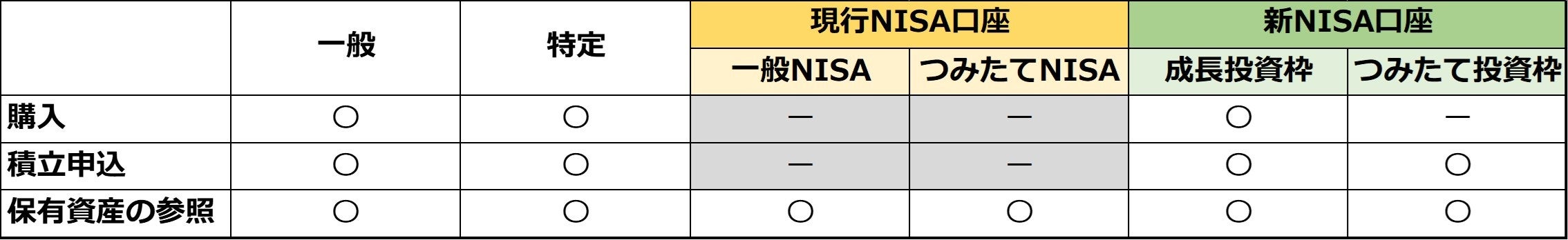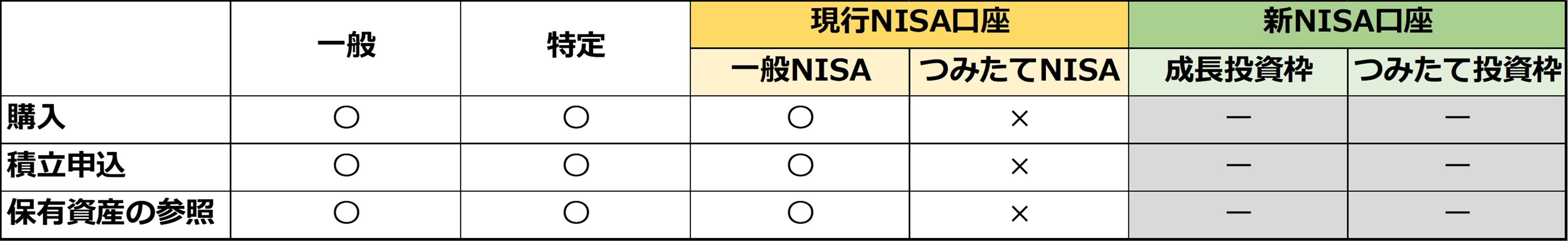 従来、「じぶん銀行アプリ」におけるauカブコム証券の投資信託のお取引では、一般・特定口座、NISA口座(一般NISA)が利用可能でした。2024年1月の新NISA制度開始に合わせた今回のサービス追加により、新NISA口座(成長投資枠・つみたて投資枠)でのお取引が可能となります。また、auカブコム証券の現行NISA口座(一般NISA・つみたてNISA)に残高を保有されているお客さまは、「じぶん銀行アプリ」より一般NISAの保有資産明細だけでなく、つみたてNISAの保有資産明細も参照可能となります。