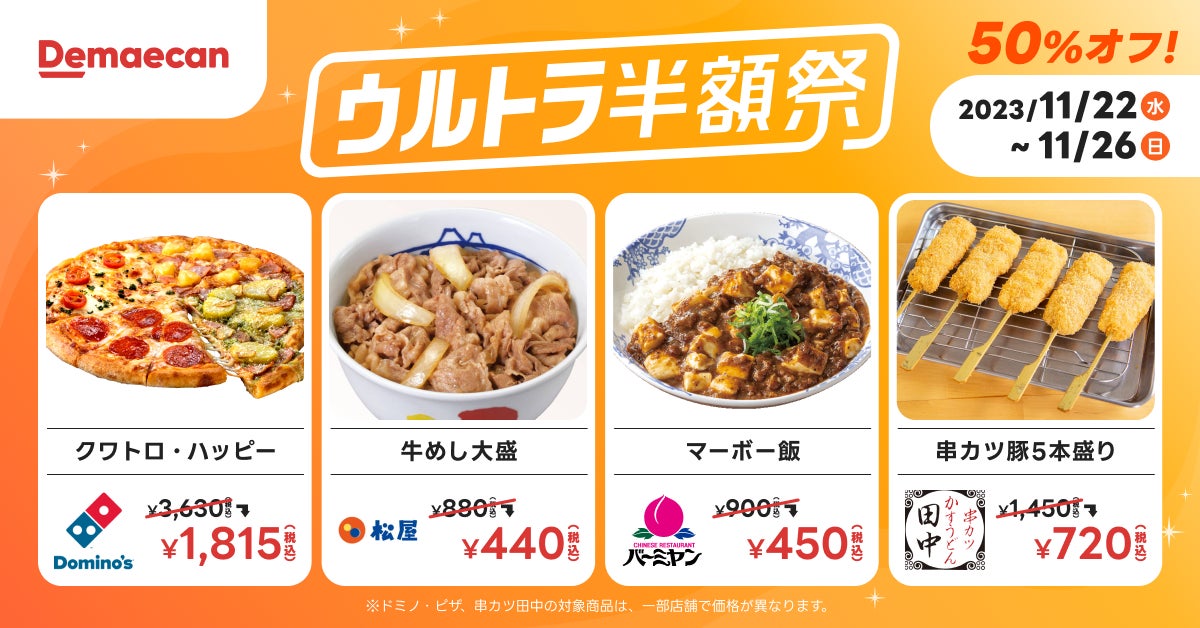 株式会社出前館(本社:東京都渋谷区、代表取締役社長:藤井英雄)が運営する日本最大級のデリバリーサービス『出前館』は、「ウルトラ半額祭」を2023年11月22日(水)~2023年11月26日(日)の5日間開催いたします。今回参加する約7,600の加盟店で、対象商品が通常価格の50%OFFでご注文いただけます。