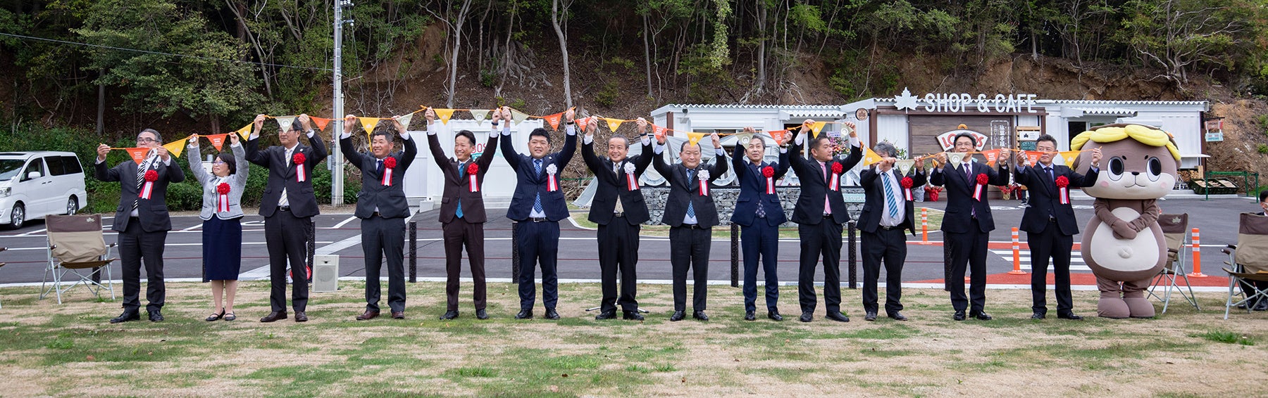 4月23日(土)のグランドオープン当日には、オープニングセレモニーを実施しました。須崎市楠瀬市長と弊社代表取締役社長柴田茂樹ならびにご来賓の方々が登壇し、須崎市マスコットキャラクター「しんじょう君」が持ってきてくれたガーランドを繋げる「ガーランド結び」を記念行事として行ったほか、高知県井上副知事をはじめとしたご来賓の方々よりご祝辞をいただきました。
