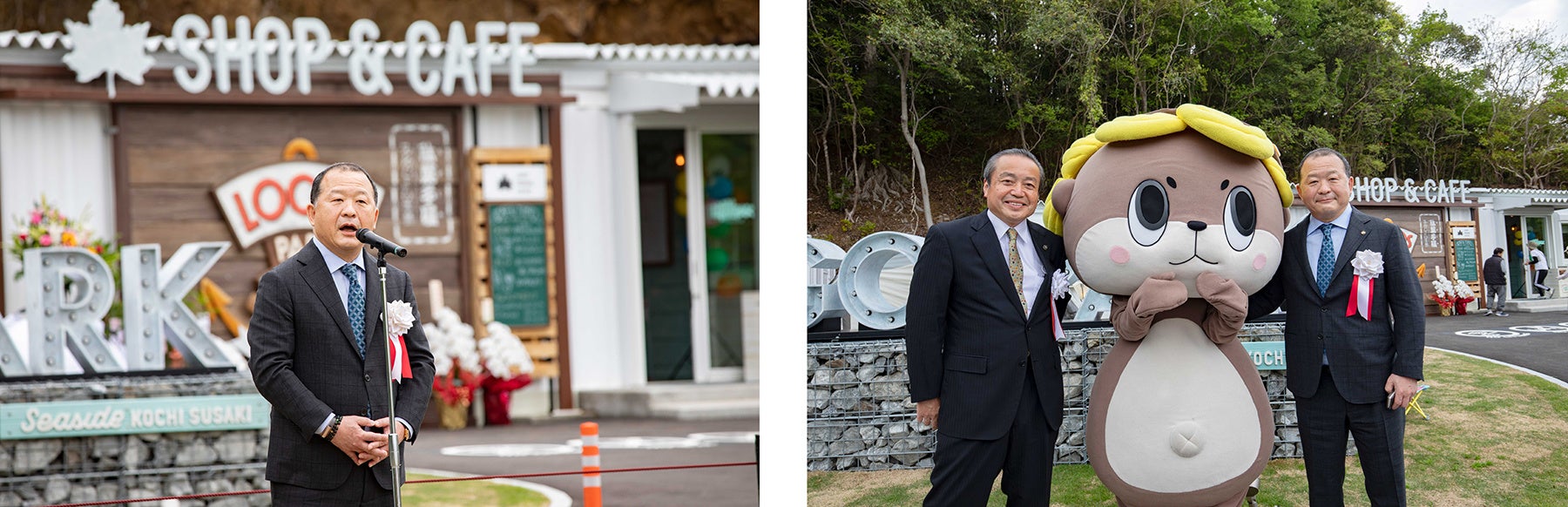 グランドオープン当日に行われたセレモニーでは、須崎市長楠瀬耕作様と弊社代表取締役社長柴田茂樹ならびにご来賓の方々が登壇し、記念行事としてキャンプにちなんだガーランド結びを行いました。シークレットゲストとして須崎市マスコットキャラクター「しんじょう君」にガーランドを持って登場いただき、会場は大盛況となりました。また、高知県井上副知事をはじめとしたご来賓の方々よりご祝辞をいただきました。