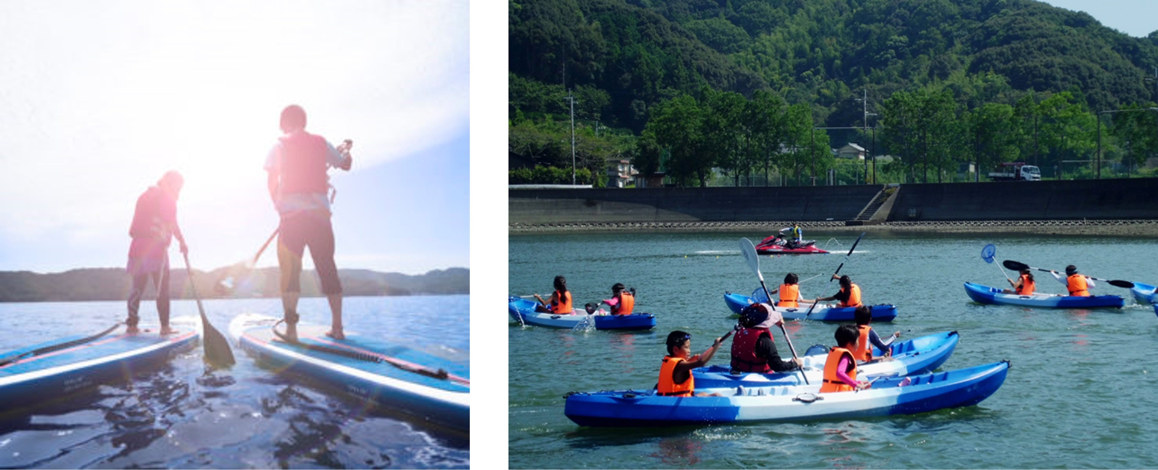 隣接するカヌー場では、シーカヤック、SUPなどのアクティビティが体験できます(通年営業予定)。夏場は「シーパーク大島」において海上アスレチックやバナナボートを楽しむことができます。