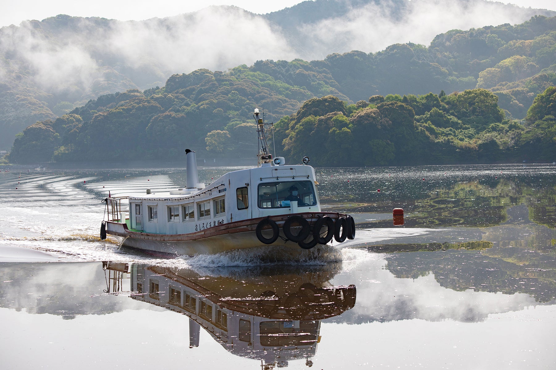 浦ノ内湾内では、通学の児童生徒を乗せた市営巡航船が運航しています。海に面した参道が特徴的な須崎市のシンボルのひとつとして市民に愛されている「鳴無神社」へは、巡航船で参拝に行き、帰りはロゴスパークまでウォーキング!