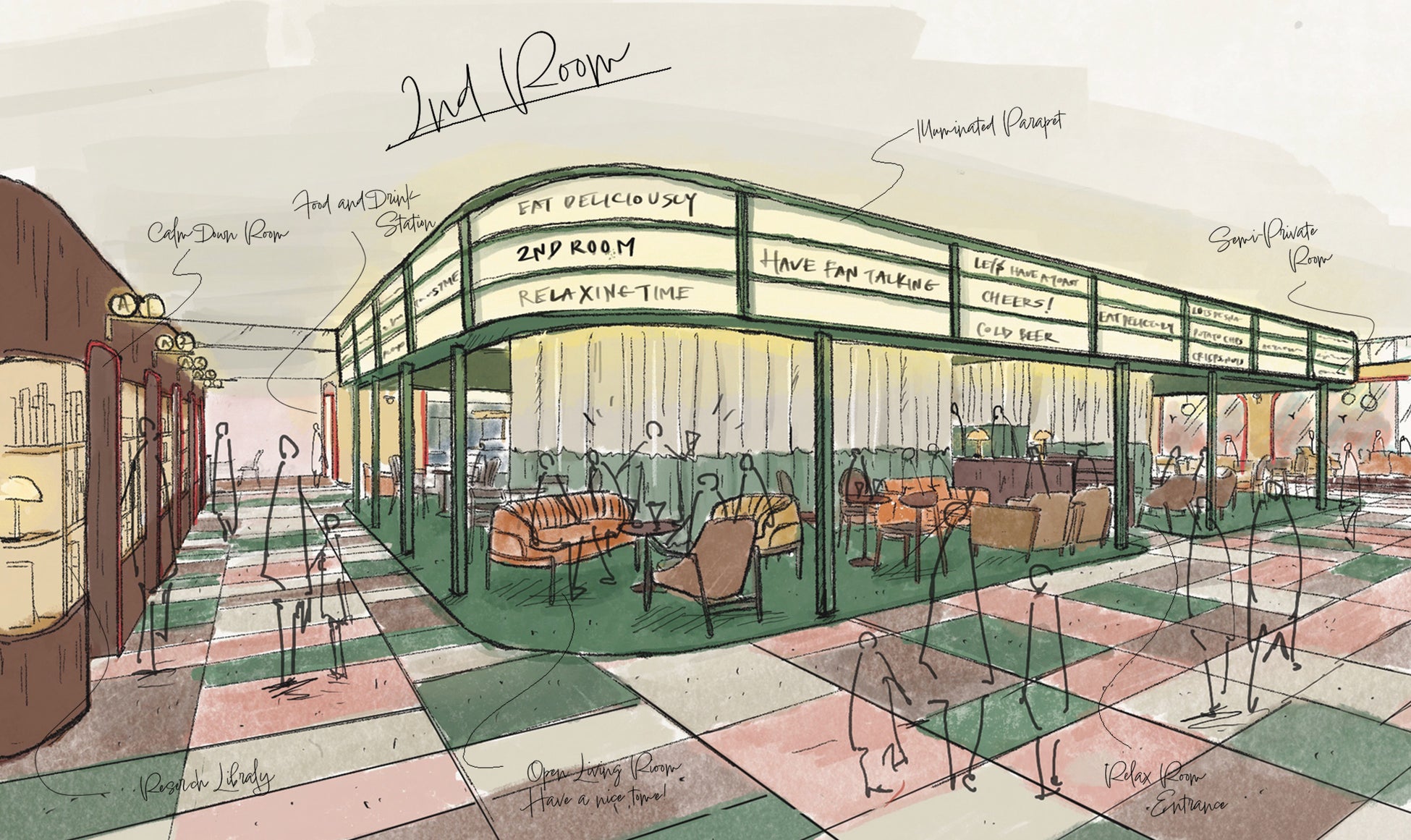 「2nd Room」は、チェックイン前やチェックアウト後も、宿泊者は誰でも24時間自由に使えるパブリックスペースです。1955年頃のアメリカを思わせる音楽が流れ、当時流行していたミッドセンチュリーデザインのインテリアや色遣いが印象的な空間です。靴を脱いで休めるスペースや、半個室として利用できるスペースなどがあり、好きなスペースを選んでくつろげます。到着後にほっと一息ついたり、家族や友人と翌日の予定を立てたり、出発の身支度を整えたりと、旅のスケジュールに合わせて思い思いの時間を過ごすことができます。