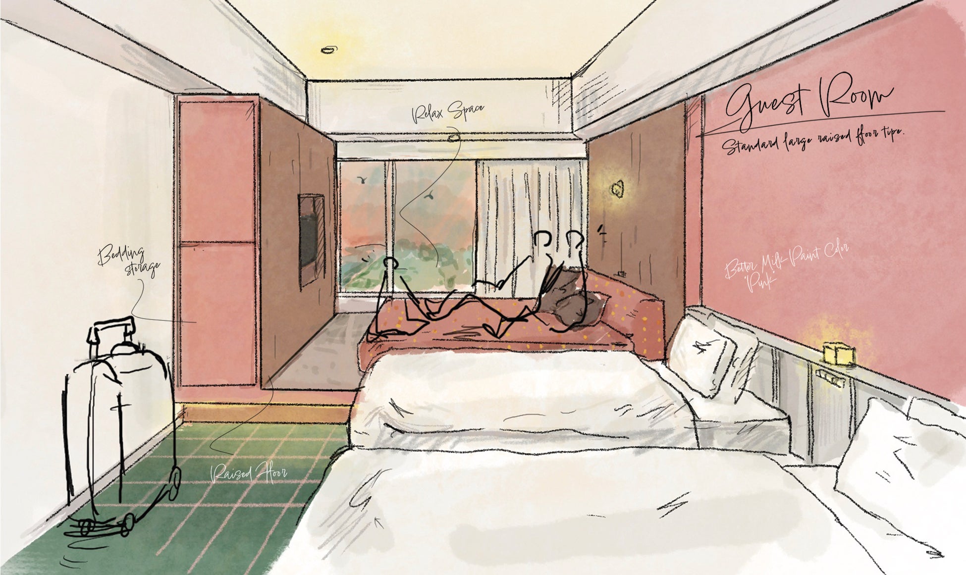 客室は全638室、23タイプ。壁紙やカーペット、ソファーなどは、1955年頃のアメリカらしく、落ち着きのある色彩を大胆に組み合わせた色遣いで、客室でもその世界観を感じながら過ごすことができます(*)。全室靴を脱いで過ごせ、一緒に宿泊する方や好みに合わせて客室タイプが選べます。