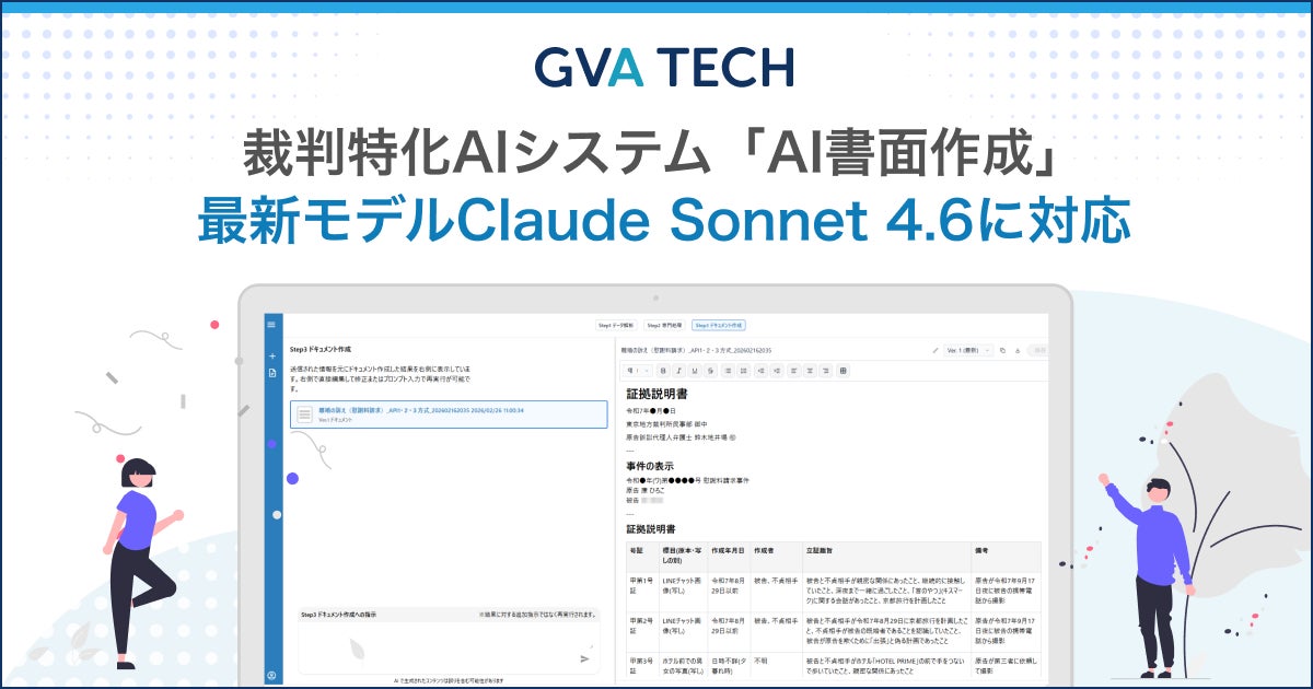 GVA TECH株式会社(本社:東京都渋谷区、代表取締役:山本 俊、以下GVA TECH)は、弁護士向け裁判特化AIシステム「AI書面作成」において、Anthropic社の最新AIモデル「Claude Sonnet 4.6」に対応したことをお知らせします。