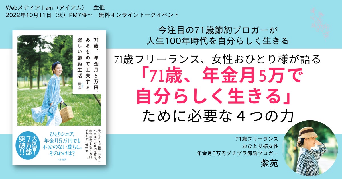 10万部目前、今話題の本『71歳、年金月5万円、あるもので工夫する楽しい節約生活』の著者で長年フリーランスとして働いてきた節約ブロガー紫苑さんにご登壇頂く本イベント。