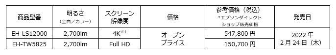 エプソンは、3LCD方式のホームプロジェクター「dreamio(ドリーミオ)シリーズ」の新商品として、4K対応(※)の高画質映像を楽しめる『EH-LS12000』と、気軽に動画配信サービスなどが楽しめる『EH-TW5825』の合計2機種を、2022年2月24日(木)より発売します。※2軸シフトテクノロジーを採用したスクリーン上の解像度となります。