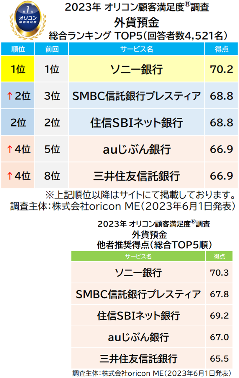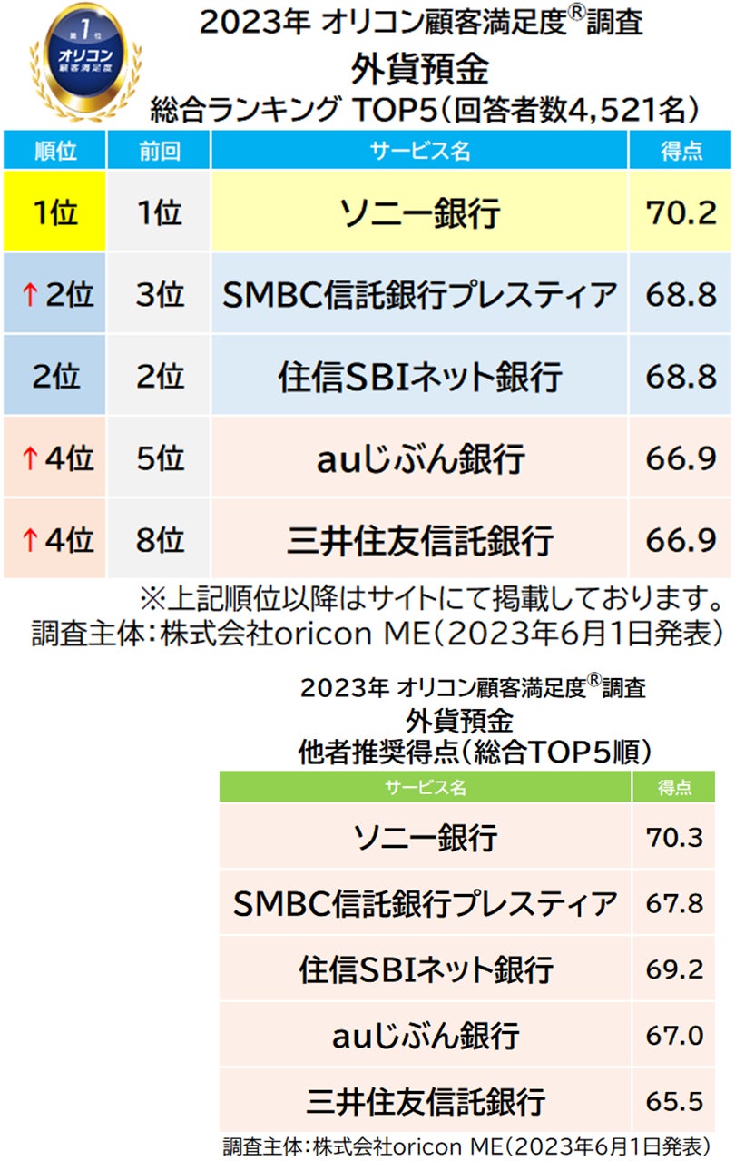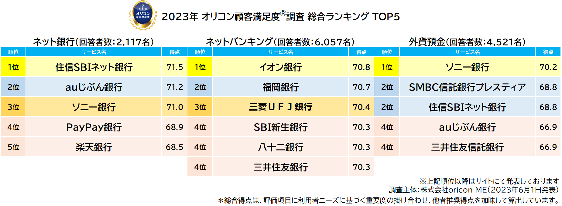 『ネット銀行』【住信SBIネット銀行】が3年連続10度目の総合1位/『ネットバンキング』【イオン銀行】が2年ぶり4度目の総合1位/『外貨預金』【ソニー銀行】が調査開始以来、4年連続総合1位
