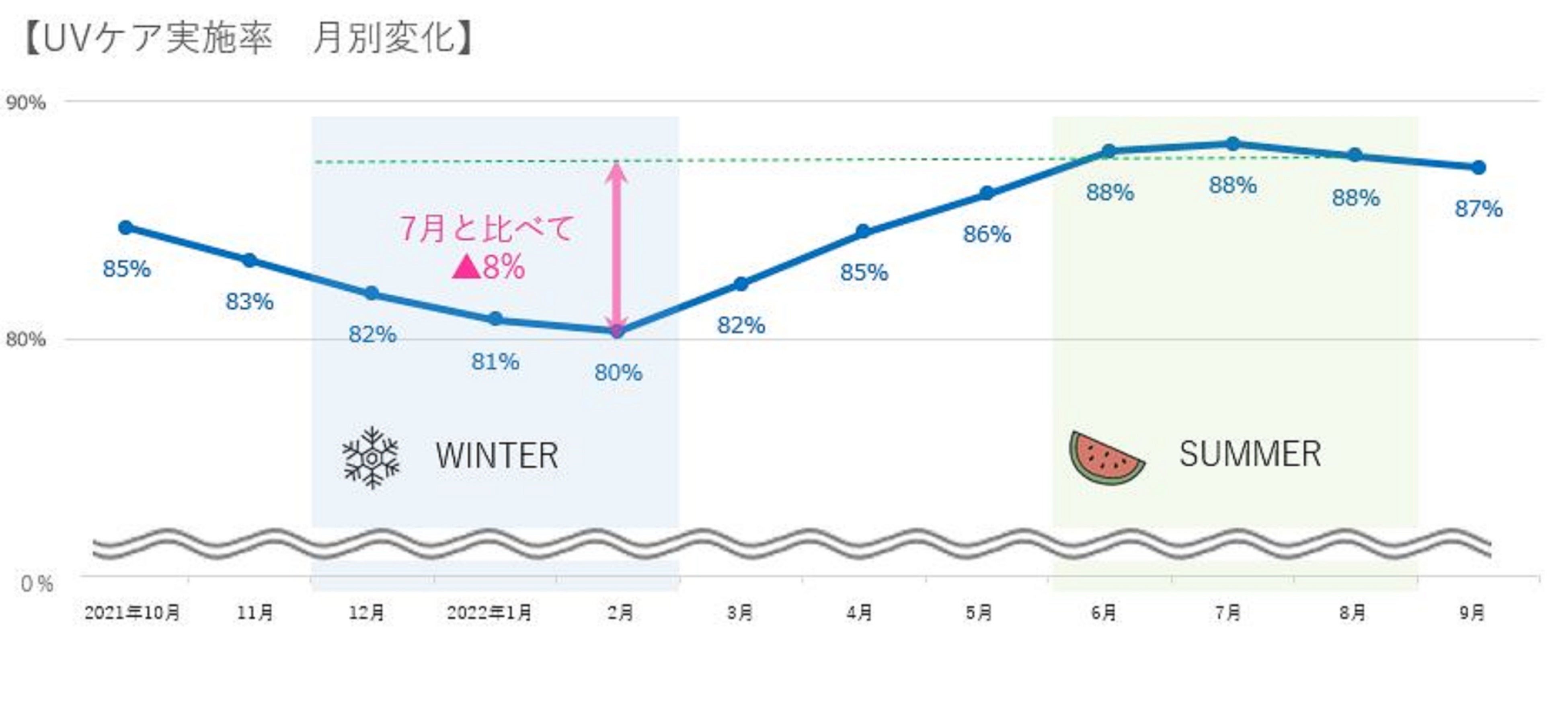 - 冬にUVケアを実施する人の割合は、夏と比べて約8%減少する。