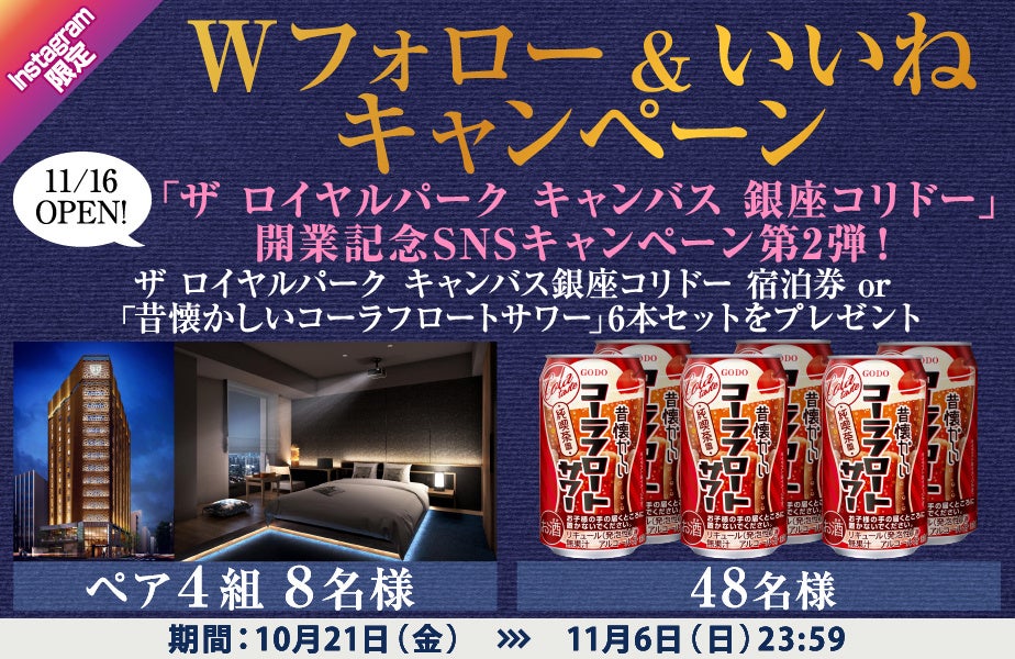 オエノングループ公式Instagramアカウントと、ザ ロイヤルパーク キャンバス 銀座コリドー公式Instagramアカウンの両方をフォロー&オエノングループ公式インスタグラムアカウントの10月21日(金)のキャンペーン投稿にいいね!で「ザ ロイヤルパーク キャンバス 銀座コリドー」ペア宿泊券を4組8名様に、「昔懐かしいコーラフロートサワー」6本セットを48名様に抽選でプレゼント。