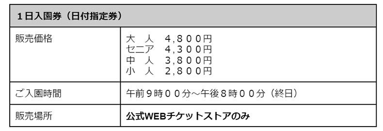 ※期間中、二日間入園券の販売、1日入園券から二日間入園券へのアップグレードも休止いたします。